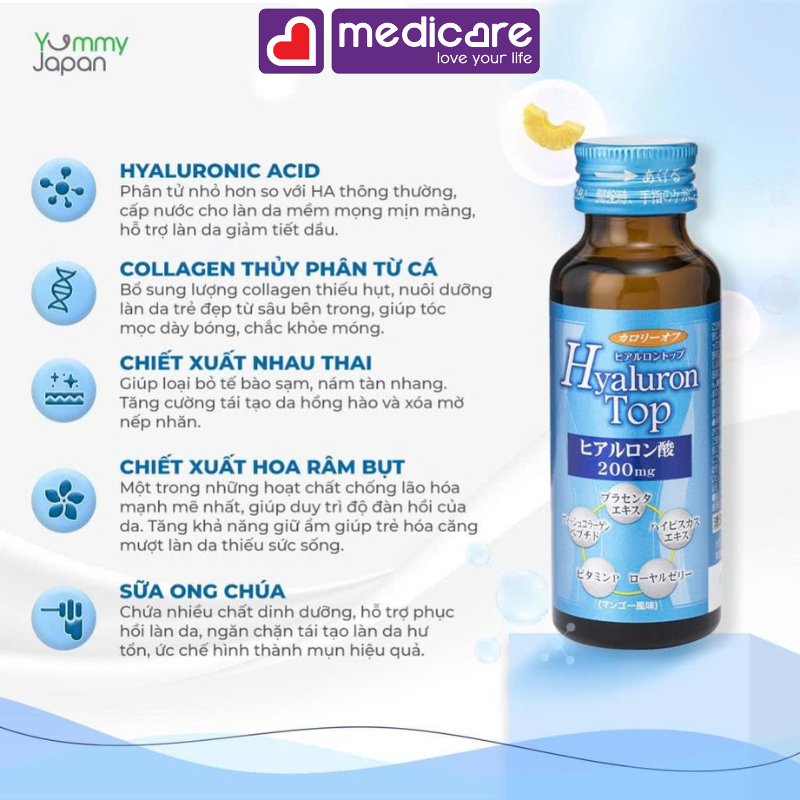NƯỚC UỐNG CẤP ẨM HYALURON TOP SHINNIPPAI 200MG HỘP 10 LỌ 50ML TRÍCH ĐOẠN SẢN PHẨM: Nước uống cấp ẩm hyaluron top shinnippai tăng cường đàn hồi, tái tạo làn da, sản phẩm được