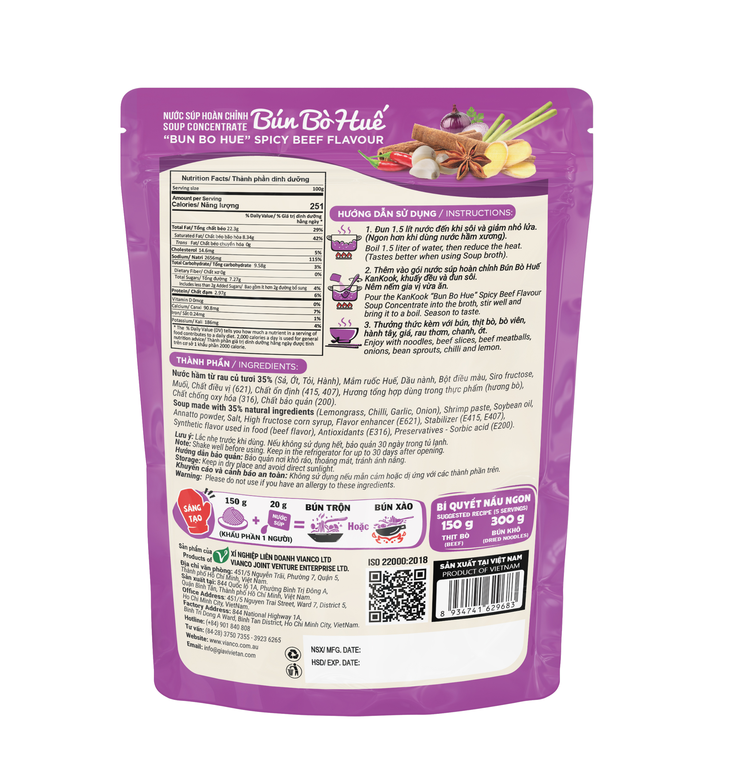 CHI TIẾT SẢN PHẨM 1. Khối lượng: 180g 2. Thành phần: Nước, muối ăn, dầu nành, sả, đường cát, hành trắng, hành tím, tỏi, mắm ruốc Huế, ớt, hương bò tổng hợp, bột quế, bột