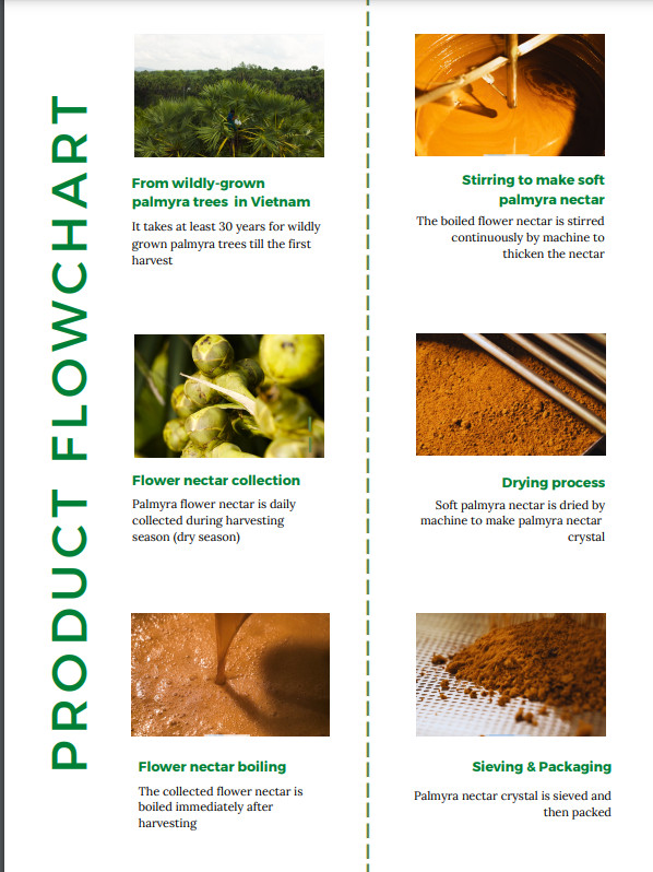 Cây thốt nốt mọc tự nhiên phải mất ít nhất 30 năm mới có thể thu hoạch được nước hoa để nấu mật. Mật thốt nốt hạt Palmania được làm từ 100% nguyên liệu tự nhiên và tuân theo nguyên tắc sản xuất bền vững.