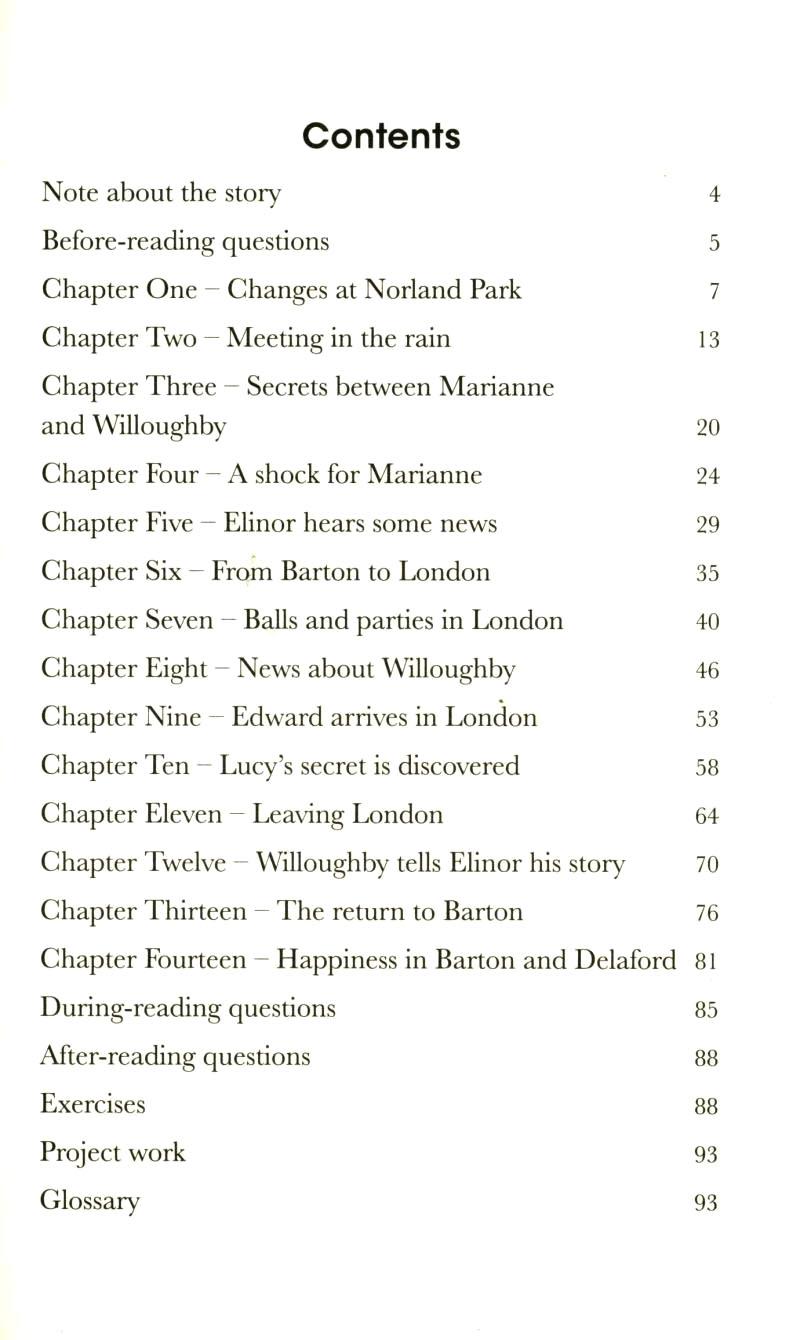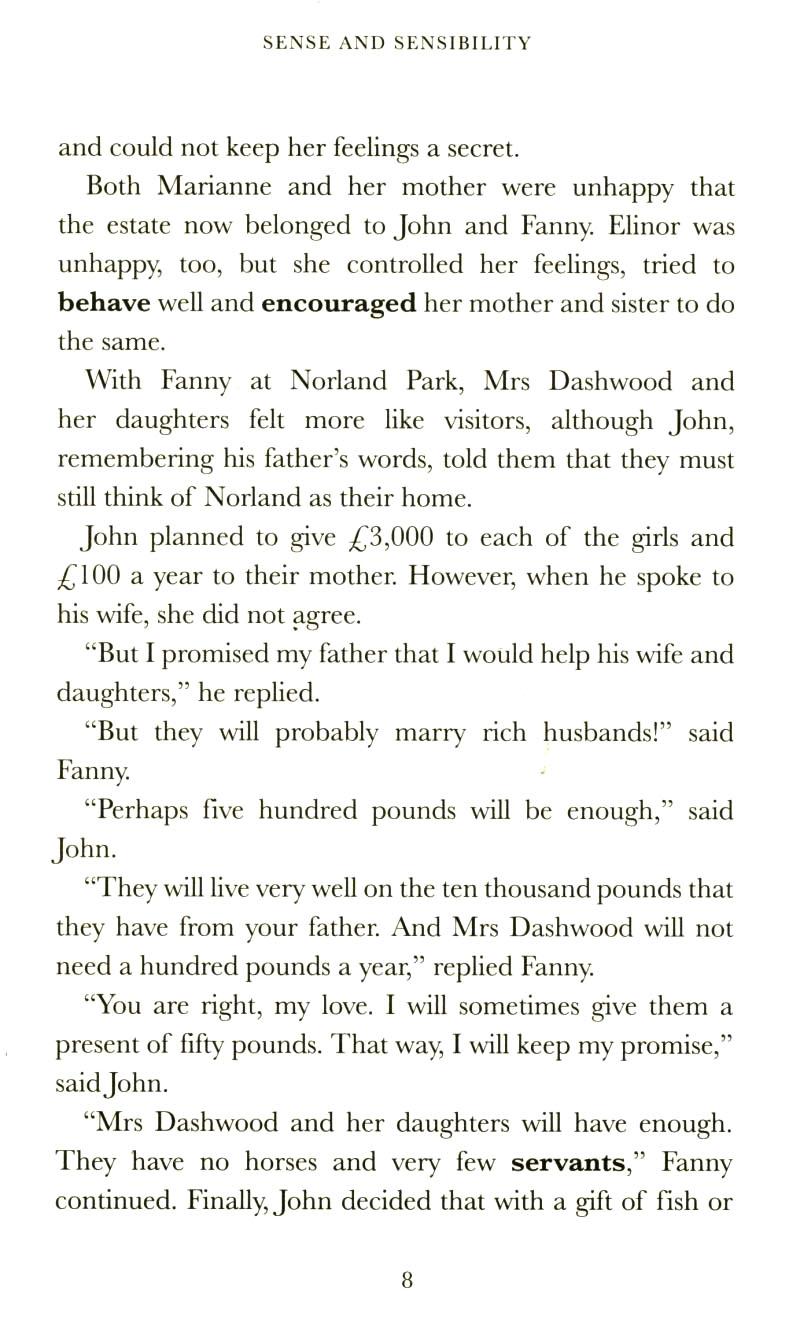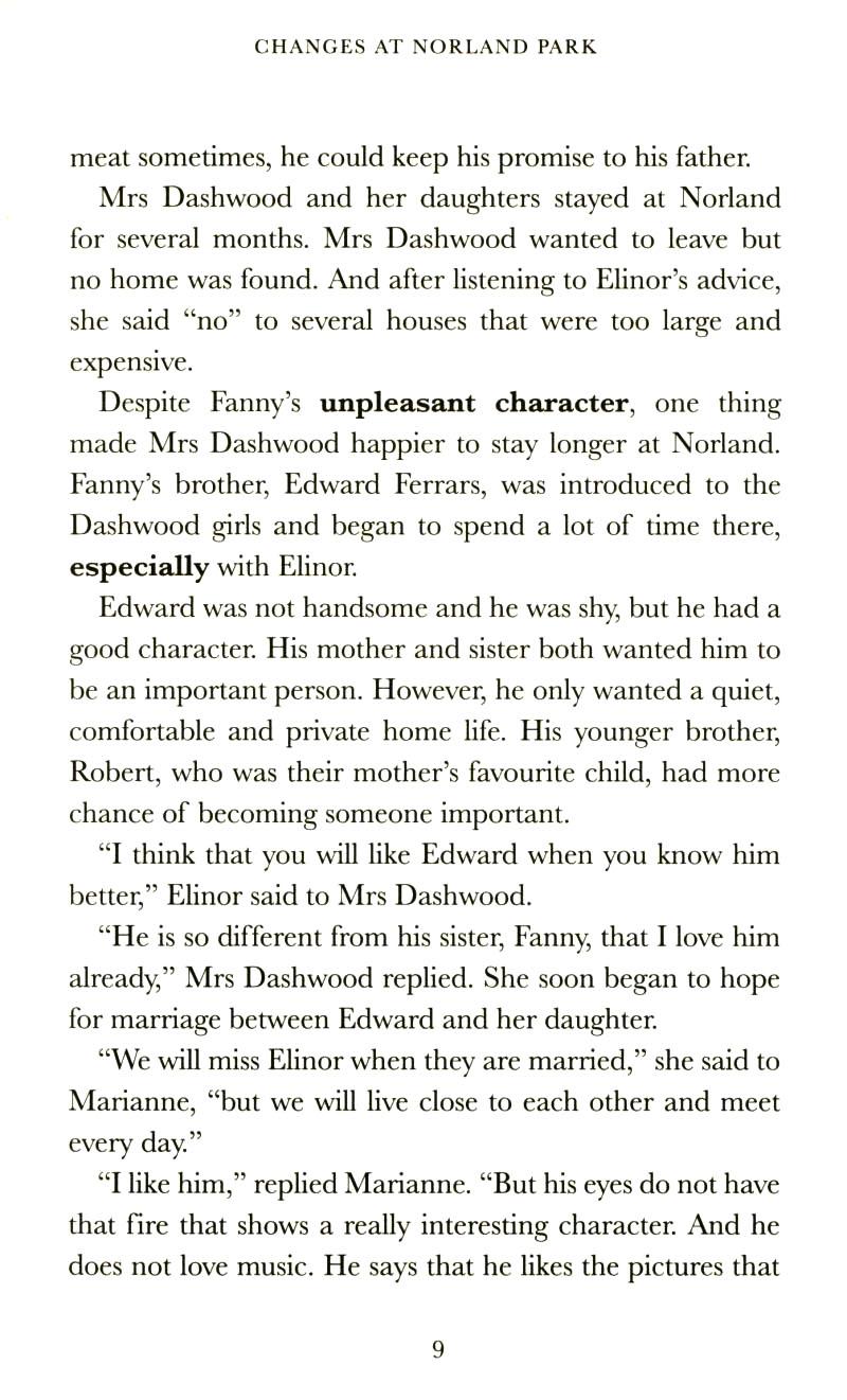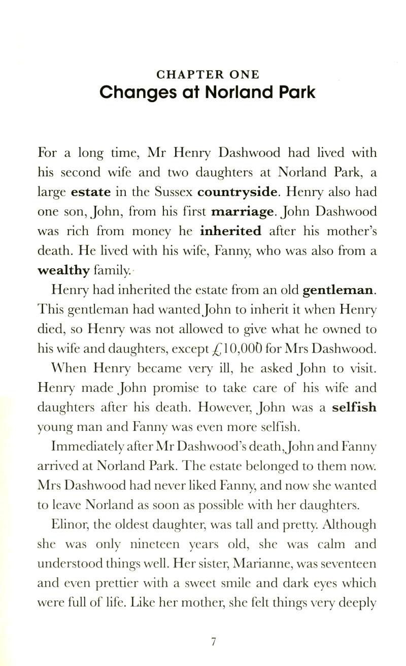 Sense and Sensibility, a Level 5 Reader, is B1 in the CEFR framework. The text is made up of sentences with up to four clauses, introducing present perfect continuous, past perfect, reported speech and second conditional. It is well supported by illustrations, which appear regularly.