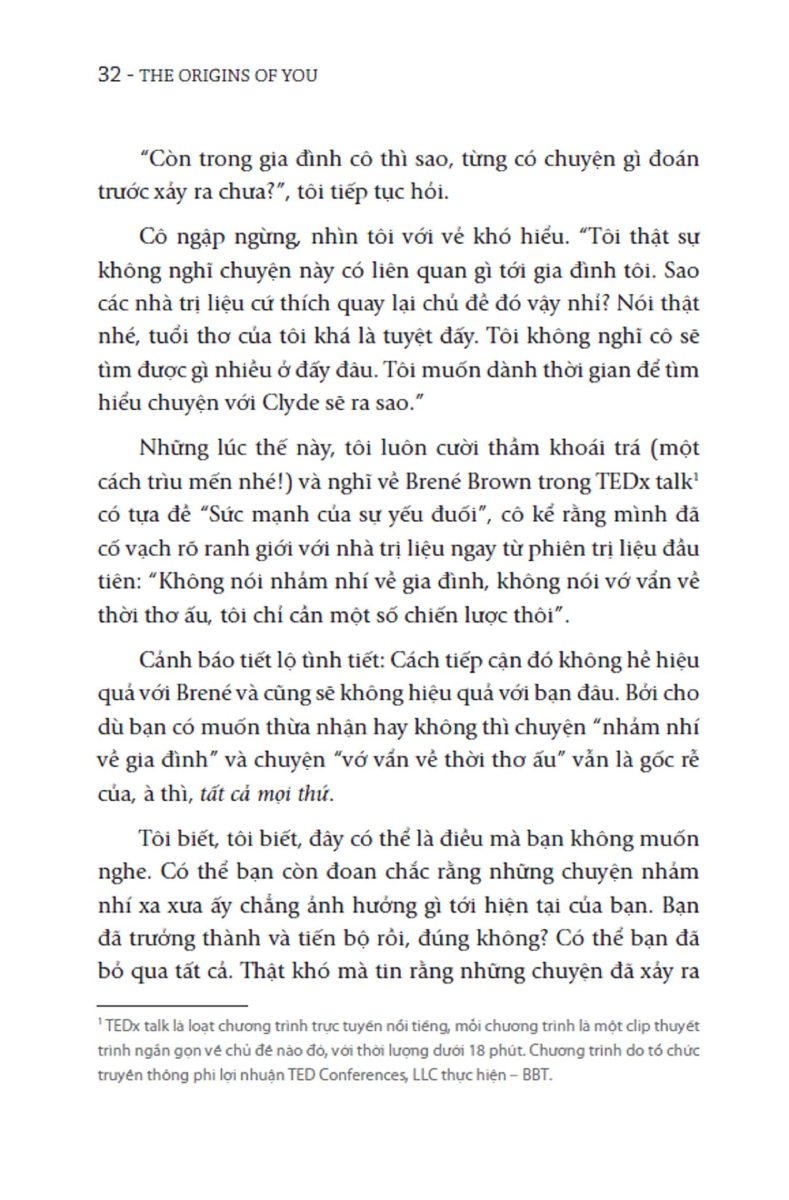 Như tác giả đã chỉ ra: “Khi còn bé, hẳn bạn đã nghe vô số lời khuyên hoặc khuyến khích rằng nên làm điều này thêm một chút, điều kia ít đi một chút để nhận được sự yêu thương, kết nối, công nhận, an toàn hoặc khẳng định từ cha mẹ hay người chăm sóc. Bạn có thể nhận được những lời nhắn nhủ từ cha mẹ, những thông điệp mà họ tưởng là vô hại, nhưng thật ra lại khiến bạn không còn là mình nữa… Bạn hẳn đã làm theo ý mọi người… Vì bạn được lập trình để tìm kiếm sự gắn bó. Vì gắn bó là điều cần thiết cho sự sinh tồn của bạn… Nhưng sự chân thật cũng cần thiết không kém gì nhu cầu gắn bó.