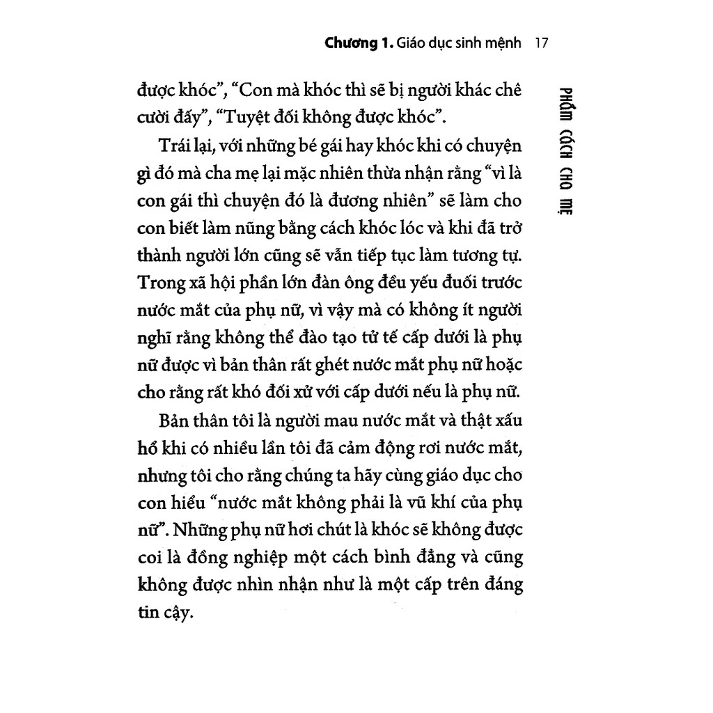 Cuốn sách Phẩm cách cha mẹ của tác giả Bando Mariko gồm 7 chương: Giáo dục sinh mệnh (bắt đầu từ lời chào hỏi, đến việc cả gia đình cùng ăn cơm, cùng con ca hát, đọc sách, khám phá thiên nhiên); Giáo dục phép tắc cư xử (cho con giúp đỡ cha mẹ, tạo cho con thói quen sinh hoạt tố); Giáo dục nhân tính (luôn giữ lời hứa, khiêm tốn vừa phải, giúp con tự ); Sự tiếp xúc với trường học, Giáo dục trẻ tuổi teen; Cách tiếp cận thông tin; Duy trì mối quan hệ giữa cha mẹ và con cái khi các con đã trưởng thành;