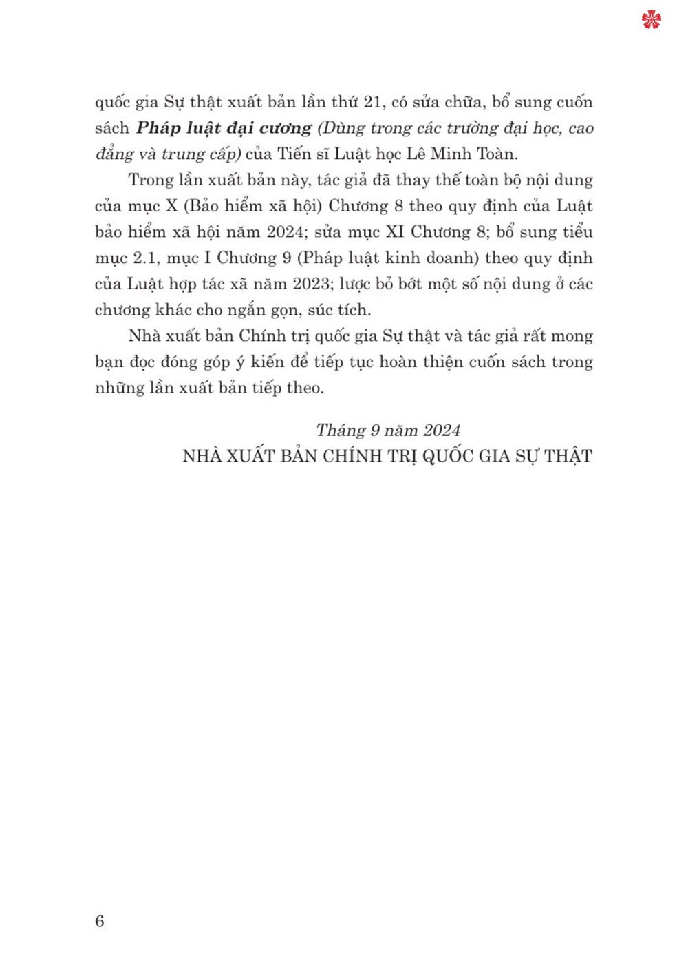 Nhằm góp phần phục vụ công tác đào tạo, bồi dưỡng những kiến thức cơ bản về nhà nước và pháp luật cho học sinh, sinh viên; cung cấp thêm tài liệu nghiên cứu, tham khảo cho giảng viên các trường đại học, cao đẳng, trung cấp, Nhà xuất bản Chính trị 5 quốc gia Sự thật xuất bản lần thứ 21, có sửa chữa, bổ sung cuốn sách Pháp luật đại cương (Dùng trong các trường đại học, cao đẳng và trung cấp) của Tiến sĩ Luật học Lê Minh Toàn. Trong lần xuất bản này, tác giả đã thay thế toàn bộ nội dung của mục X (Bảo hiểm xã hội) Chương 8 theo quy định của Luật bảo hiểm xã hội năm 2024; sửa mục XI Chương 8; bổ sung tiểu mục 2.1, mục I Chương 9 (Pháp luật kinh doanh) theo quy định của Luật hợp tác xã năm 2023; lược bỏ bớt một số nội dung ở các chương khác cho ngắn gọn, súc tích.