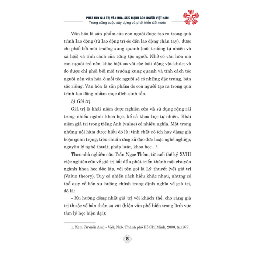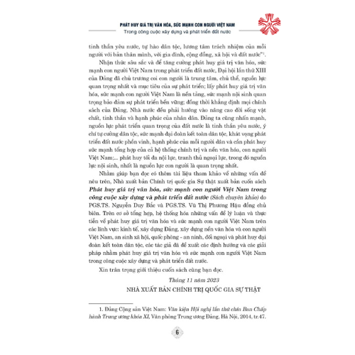 Nhằm giúp bạn đọc có thêm tài liệu tham khảo về những vấn đề nêu trên, Nhà xuất bản Chính trị quốc gia Sự thật xuất bản cuốn sách Phát huy giá trị văn hóa, sức mạnh con người Việt Nam trong công cuộc xây dựng và phát triển đất nước (Sách chuyên khảo) do PGS.TS. Nguyễn Duy Bắc và PGS.TS. Vũ Thị Phương Hậu đồng chủ biên.