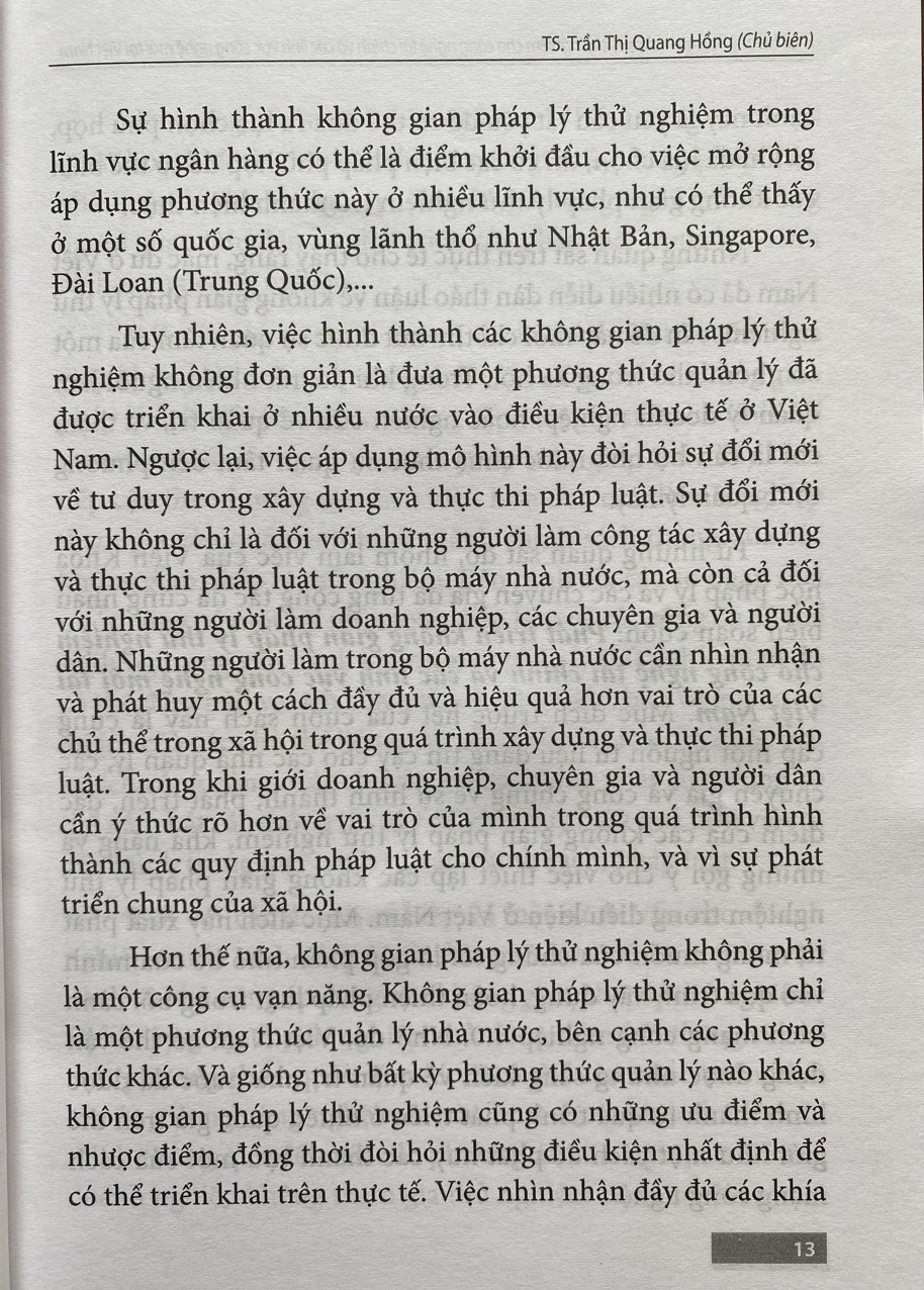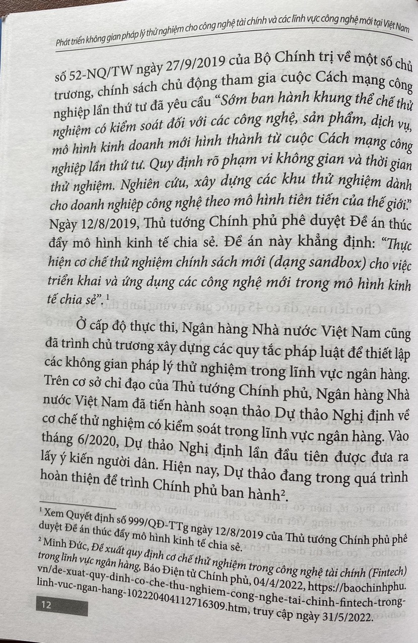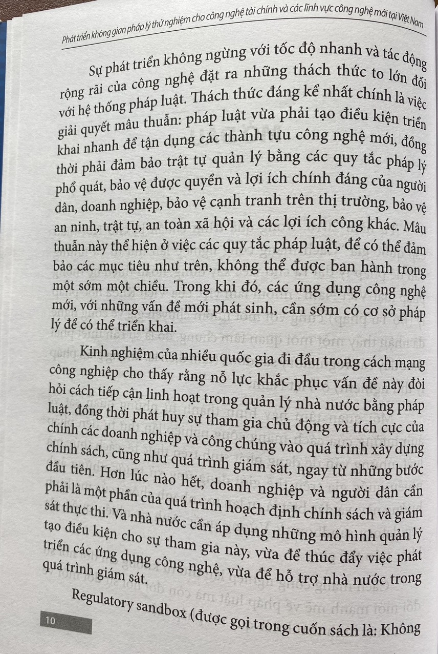 Từ những quan sát đó, nhóm làm việc của Viện Khoa học pháp lý và các chuyên gia từng cộng tác đã cùng nhau biên soạn cuốn sách: Phát triển không gian pháp lý thử nghiệm (Regulatory Sandbox) cho FinTech và các lĩnh vực công nghệ mới tại Việt Nam. Mục đích trước hết của cuốn sách này là cung cấp một nguồn tư liệu đáng tin cậy cho những người quản lý, các chuyên gia và công chúng về sự hình thành, phát triển, đặc điểm của các không gian pháp lý thử nghiệm, khả năng và những gợi ý cho việc thiết lập các không gian pháp lý thử nghiệm trong điều kiện ở Việt Nam. Mục đích này xuất phát từ mong muốn của chúng tôi là góp phần nhỏ bé của mình vào quá trình xây dựng, hoàn thiện pháp luật trong bối cảnh CMCN 4.0. Nhờ đó, Việt Nam có thể tận dụng được những sáng kiến về quản trị nhà nước đã được hình thành từ quá trình phát triển ở nhiều quốc gia trên thế giới như một cách để tận dụng được những thành tựu mới của cuộc cách mạng công nghệ.