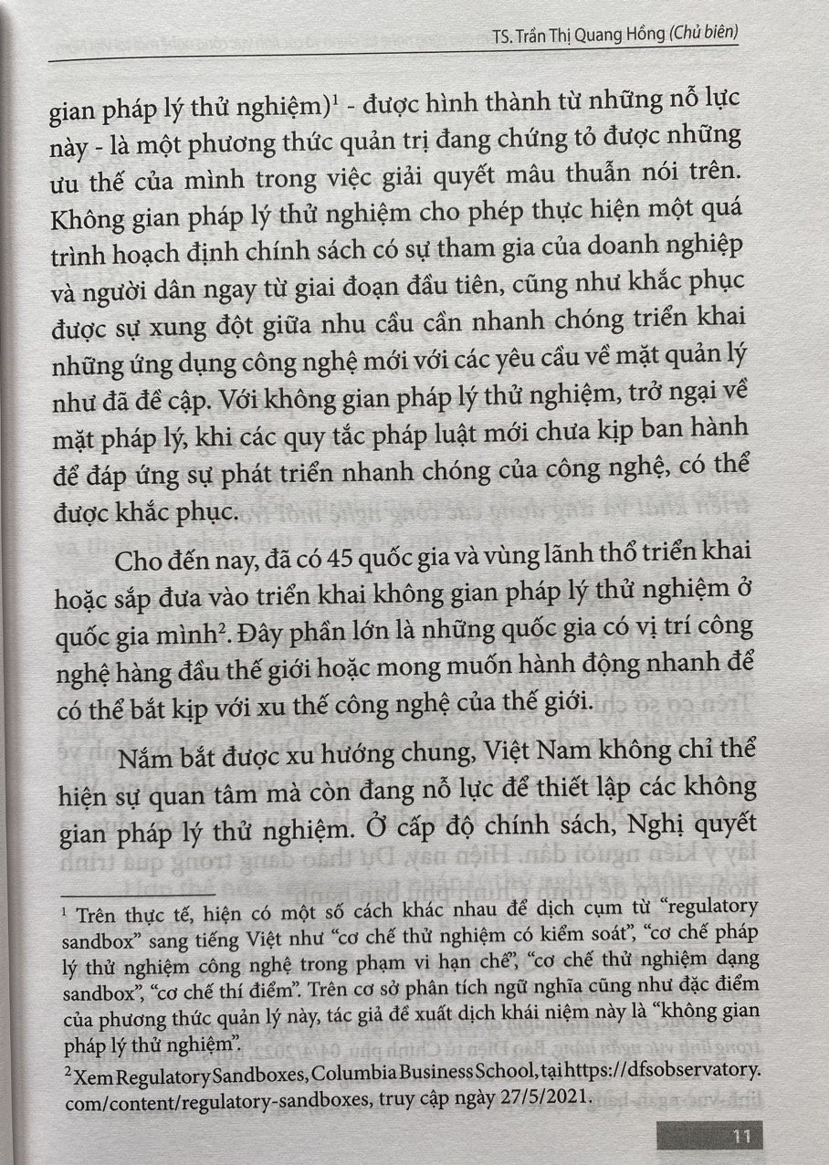 Regulatory sandbox (được gọi trong cuốn sách này là: Không gian pháp lý thử nghiệm)– được hình thành từ những nỗ lực này – là một phương thức quản trị đang chứng tỏ được những ưu thế của mình trong việc giải quyết mâu thuẫn nói trên. Không gian pháp lý thử nghiệm cho phép thực hiện một quá trình hoạch định chính sách có sự tham gia của doanh nghiệp và người dân ngay từ giai đoạn đầu tiên, cũng như khắc phục được sự xung đột giữa nhu cầu cần nhanh chóng triển khai những ứng dụng công nghệ mới với các yêu cầu về mặt quản lý như đã đề cập. Với không gian pháp lý thử nghiệm, trở ngại về mặt pháp lý, khi các quy tắc pháp luật mới chưa kịp ban hành để đáp ứng sự phát triển nhanh chóng của công nghệ, có thể được khắc phục.