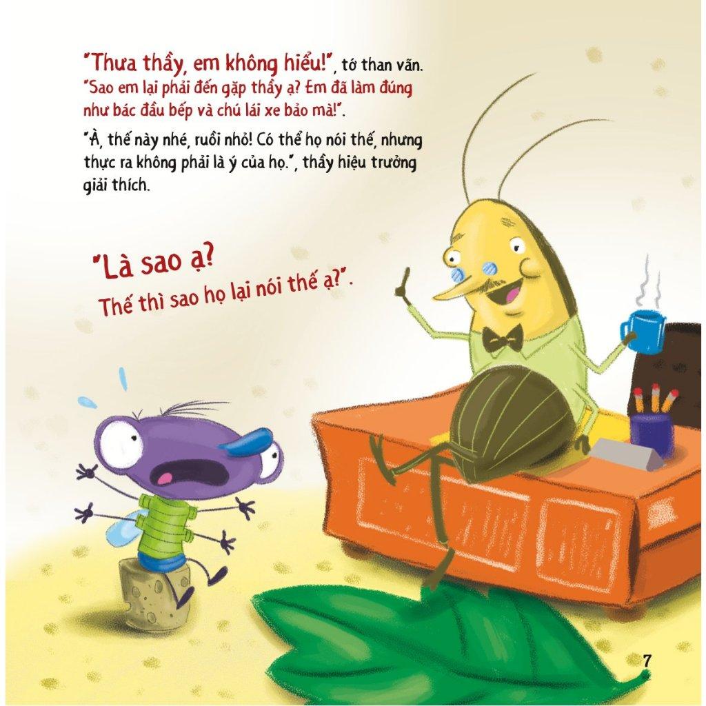Nói vậy mà không phải vậy: Câu chuyện kể về bạn ruồi nhỏ gặp phải rắc rối ngay cả khi cậu đã tập trung lắng nghe trong giao tiếp. Thì ra chỉ tập trung lắng nghe thôi chưa đủ vì nhiều khi “nói vậy mà không phải vậy”. Thầy hiệu trưởng và bố đã hướng dẫn ruồi nhỏ “kết nối các dấu hiệu giao tiếp” như giọng nói, nét mặt, điệu bộ, cử chỉ để giúp cậu gỡ rối.