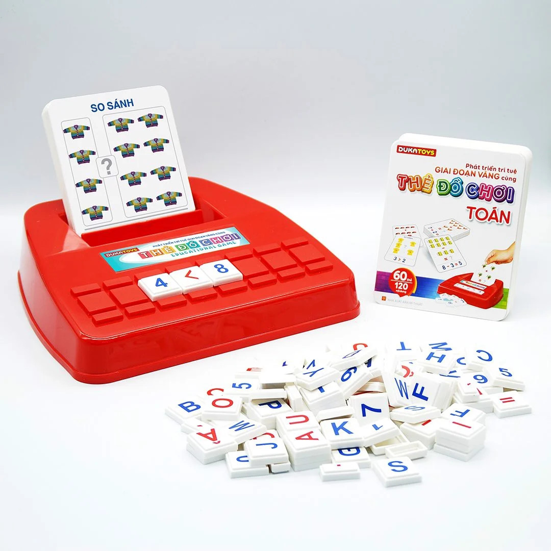 Phát triển trí tuệ giai đoạn vàng cùng thẻ đồ chơi         Các bậc cha mẹ có lẽ đã biết, giai đoạn vàng trong quá trình phát triển não bộ của trẻ là từ 0 - 6 tuổi. Trong khoảng thời gian này, nếu cha mẹ biết nắm bắt và cho con mình tiếp xúc, làm quen dần với ngôn ngữ và Toán học, sẽ có lợi vô cùng đối với quá trình phát triển trí tuệ của trẻ sau này. Hơn nữa, trong hành trình phát triển của con, vai trò của cha mẹ là vô cùng quan trọng. Việc cha mẹ cùng con học hỏi và từng bước tìm hiểu thế giới xung quanh sẽ giúp tình cảm cha mẹ và con thêm gắn kết, con sẽ thêm hào hứng và tự tin khám phá cuộc sống đầy mới mẻ.    Nắm bắt tâm thái ấy và nhằm hướng đến một thế hệ tương lai đầy triển vọng, Duka xin giới thiệu đến quý phụ huynh bộ thẻ thông minh với cách học đầy hứng thú và sáng tạo - " Phát triển trí tuệ giai đoạn vàng cùng thẻ đồ chơi". Theo đúng tiêu chí " Chơi mà học, học mà chơi", Duka hy vọng rằng cha mẹ sẽ dành thời gian hướng dẫn con, cùng chơi với con để trẻ thêm hào hứng tích lũy nền tảng kiến thức, trau dồi trí tuệ, hướng tới tương lai.  Hướng dẫn cách chơi:    Phụ huynh ngồi chơi cùng trẻ, chọn một tấm thẻ để trẻ quan sát sao cho trẻ không nhìn thấy phần chữ, số, hoặc phép toán bên dưới thẻ.   Phụ huynh hỏi thẻ tên gọi sự vật trên tấm thẻ, phân tích các hình ảnh hoặc hướng dẫn trẻ tư duy để tìm ra phép toán hợp lí.  Khi trẻ gọi đúng tên sự vật, hoặc nói đúng phép toán phù hợp với hình ảnh, phụ huynh hãy gợi ý trẻ ghép tên sự vật hoặc hoàn thành phép toán bằng cách tìm các chữ cái, các con số và dấu có trong dụng cụ đồ chơi rồi ghép lên phần đính hạt chữ ở hộp đồ chơi.   Cuối cùng, phụ huynh hãy kiểm tra xem trẻ có ghép đúng chữ cái hoặc phép toán như trên thẻ không?  Thông Tin Sản Phẩm