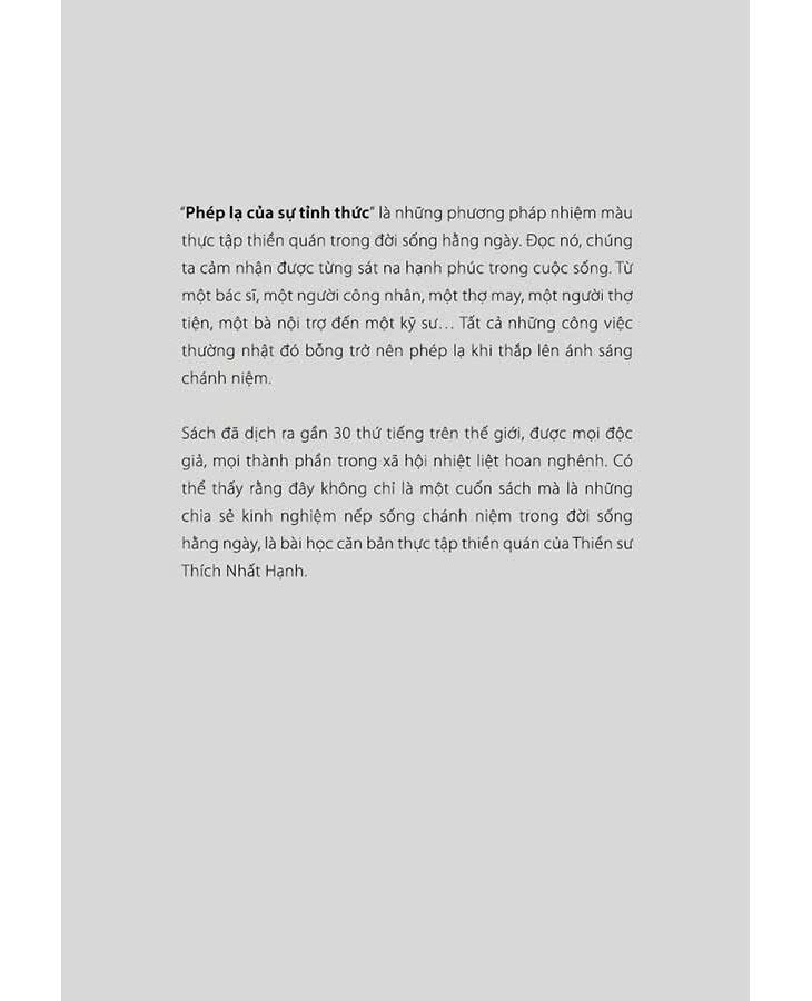 Phép Lạ Của Sự Tỉnh Thức là những phương pháp nhiệm mầu thực tập thiền quán trong đời sống hàng ngày. Đọc nó, chúng ta cảm nhận được từng sát na hạnh phúc trong cuộc sống. Từ một bác sĩ, một người công nhân, một thợ may, một người thợ tiện, một bà nội trợ đến một kỹ sư Tất cả những công việc thường nhật đó bỗng trở nên phép lạ khi thắp lên ánh sáng chánh niệm.