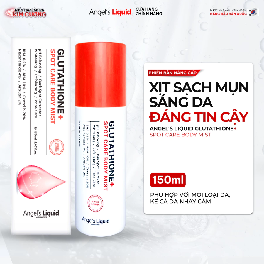 PHIÊN BẢN NÂNG CẤP] Xịt Giảm Mụn Lưng Sáng Da Cơ Thể Angel's Liquid Glutathione+ Spot Care Body Mist 150ml THÔNG TIN SẢN PHẨM    Xịt sạch mụn, sáng da body đáng tin cậy Angel's Liquid Glutathione+ Spot Care Body Mist 150ml - phiên bản xịt body dược mỹ phẩm đầu tiên mới nâng cấp, được ra mắt với mục tiêu mang đến một giải pháp hỗ trợ sạch mụn, mờ thâm, trắng da và ngăn ngừa mụn cơ thể tái phát tối ưu hơn với độ tin cậy cao hơn nhờ sự nghiên cứu kỹ lưỡng của các chuyên gia da liễu hàng đầu Hàn Quốc.  Nổi bật với công thức mới nâng cấp các thành phần hoạt động mạnh và hiệu quả trên da, từ đó, giúp loại bỏ lớp da cũ, làm sạch sâu lỗ chân lông, giảm sưng mụn, gom khô cồi mụn, ngăn ngừa mụn hình thành, đồng thời, phục hồi, ngăn ngừa thâm và dưỡng trắng da body, tất cả gói gọn trong 1 sản phẩm duy nhất. Bên cạnh đó, thiết kế cải tiến dạng vòi xịt phun sương truyền thống nhưng có thể xoay đa chiều 360 độ  đầu tiên và duy nhất trên thị trường giúp tiếp cận mọi ngóc ngách trên cơ thể một cách dễ dàng.  ƯU ĐIỂM NỔI BẬT   Sản phẩm mới với công thức nâng cấp mạnh mẽ tập trung vào cơ chế giảm sưng mụn mạnh mẽ, gom khô cồi, mờ thâm, dưỡng trắng và ngăn ngừa mụn quay trở lại một cách tối ưu. Hỗ trợ xử lý tất cả mọi vấn đề da cơ thể, từ mụn đến dày sừng nang lông, tắt nghẽn nang lông, cấp ẩm, phục hồi, dưỡng trắng da sáng mịn hơn Sản phẩm dược mỹ phẩm tiên phong đi kèm với các chứng nhận lâm sàng, nghiên cứu phân tích mang lại độ pH chuẩn (3.7-5.7) rất an toàn, lành tính và hạn chế kích ứng trên da, kể cả da nhạy cảm. Thiết kế vòi xịt thông minh độc quyền 360 độ giúp dưỡng chất dễ dàng tiếp cận đến những vùng da khó nhằn nhất.   THÀNH PHẦN VÀ CÔNG DỤNG CHÍNH   10% AHA & 0.5% BHA giúp bạt sừng, loại bỏ lớp da cũ và làm sạch sâu lỗ chân lông để ngăn ngừa các tác nhân gây mụn, đồng thời cho da mềm mịn, giảm bớt tình trạng sần sùi, tắt nghẽn nang lông 20% tinh chất rau má kết hợp với tinh chất tràm trà giúp kiểm soát dầu nhờn, cung cấp độ ẩm, làm dịu da, khử khuẩn, hỗ trợ giảm mụn mạnh mẽ 4% Niacinamide, 2% Arbutin & Glutathione giúp dưỡng trắng, sáng da, đều màu da, ngăn ngừa thâm sau mụn Phức hợp các chiết xuất tự nhiên như rau má, nha đam (lô hội), lá trà, rau sam cùng với Allantoin, Kojyl Carboxy Dipeptide-23 giúp làm dịu, hỗ trợ phục hồi da, hỗ trợ chống oxy hoá, cải thiện cấu trúc da và tăng cường hàng rào bảo vệ da đáng kể Method: hỗ trợ kháng khuẩn, làm dịu nốt mụn sưng nhanh chóng, tạo cảm giác mát lạnh, dễ chịu sau khi sử dụng.   CÁCH BẢO QUẢN   Bảo quản nơi thoáng mát  Tránh xa tầm tay trẻ em Tránh ánh sáng trực tiếp, nơi có nhiệt độ cao   CÂU CHUYỆN THƯƠNG HIỆU   Hơn 10 năm không ngừng nghiên cứu và ứng dụng các công nghệ tiên tiến vào ngành mỹ phẩm để tìm ra những hướng đi mới, những giải pháp mới để kiến tạo làn da “kim cương”, Angel’s Liquid đã được hình thành là một hãng dược mỹ phẩm tiên phong cho xu hướng dưỡng trắng da từ Glutathione.