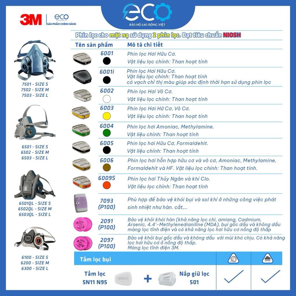 Phin lọc 3M dòng 6000 (gồm các mã 6001, 6003, 6006) kết hợp với tấm lọc bụi 5N11 và nắp giữ 501 là giải pháp bảo vệ hô hấp hiệu quả trong môi trường có