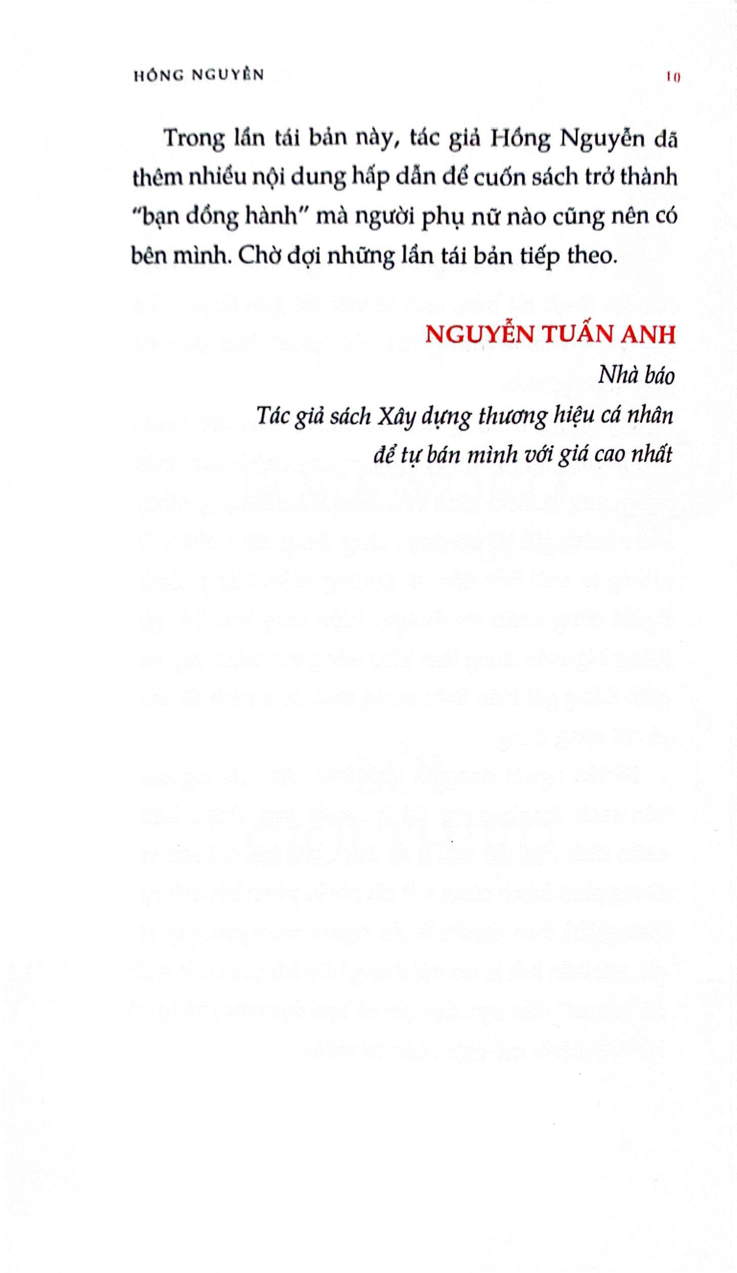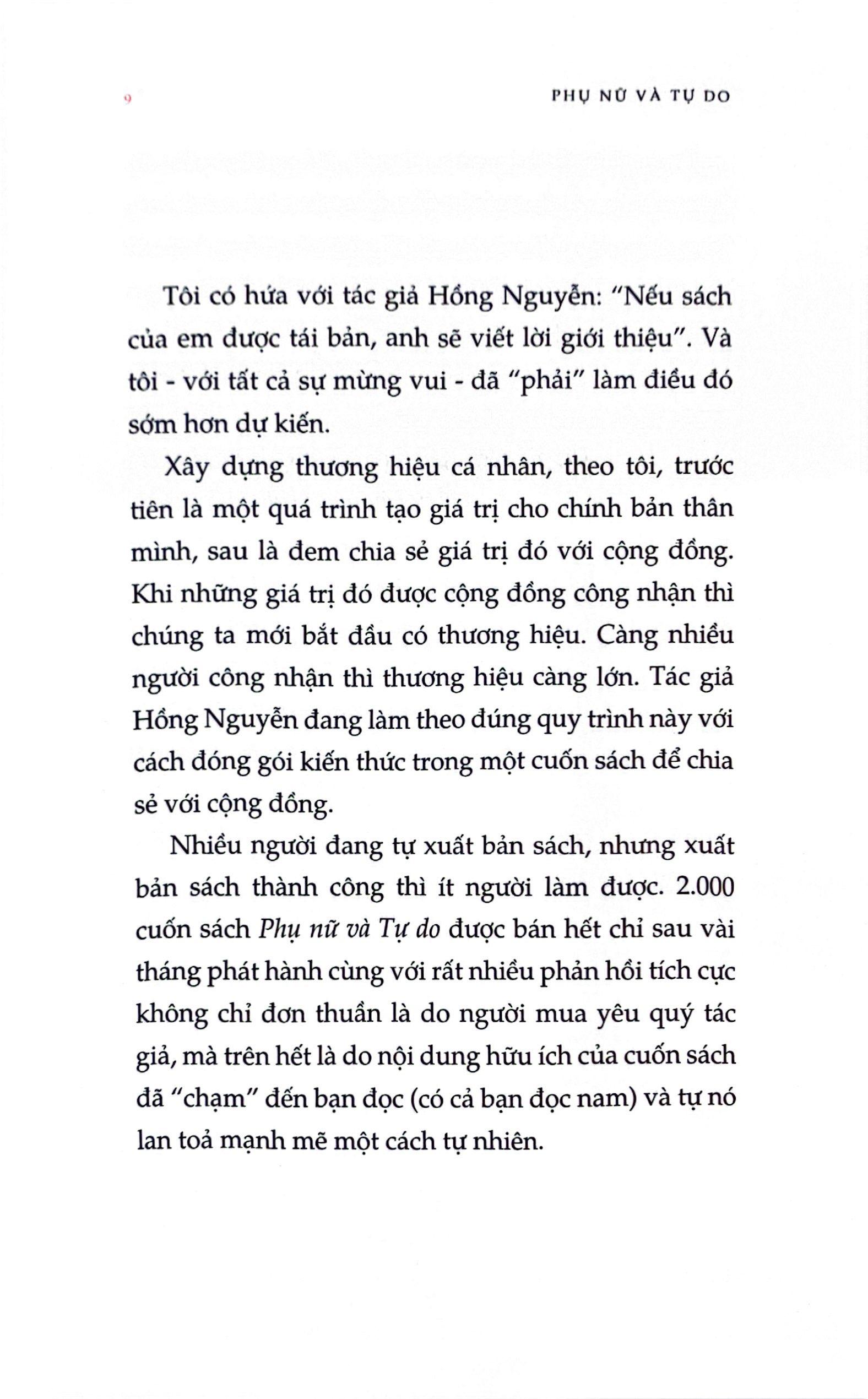 Sau thành công của lần in đầu tiên với 2.000 bản, sách Phụ nữ và Tự do của tác giả Hồng Nguyễn đã được tái bản lần 1 với nhiều thay đổi cả về nội dung và hình thức. Nhiều nội dung được tác giả cập nhật, trong đó có bổ sung hơn 50 trang nội dung. Hình thức trình bày và chất liệu giấy cũng được điều chỉnh để phục vụ bạn đọc được tốt hơn.