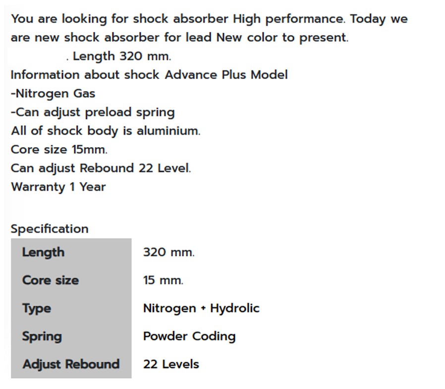 CHIỀU DÀI PHUỘC NHÚN: 350 mm Xuất xứ: Công ty TNHH công nghệ JMS Hàng mới 100% Dây chuyển sản xuất công nghệ Việt - Nhật Các tính năng nổi trội của Phuộc( giảm xóc)