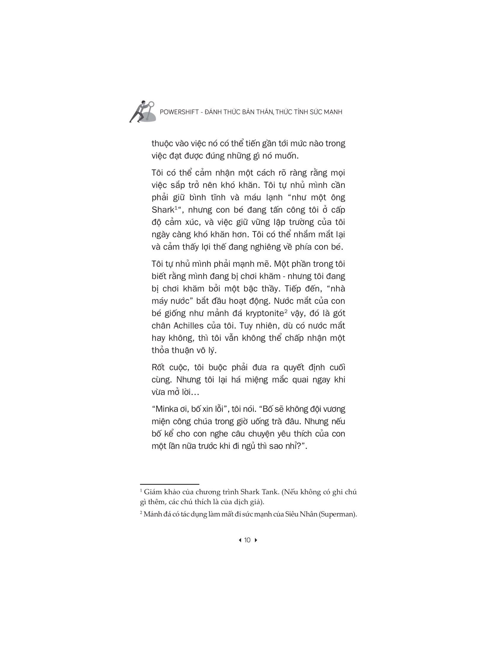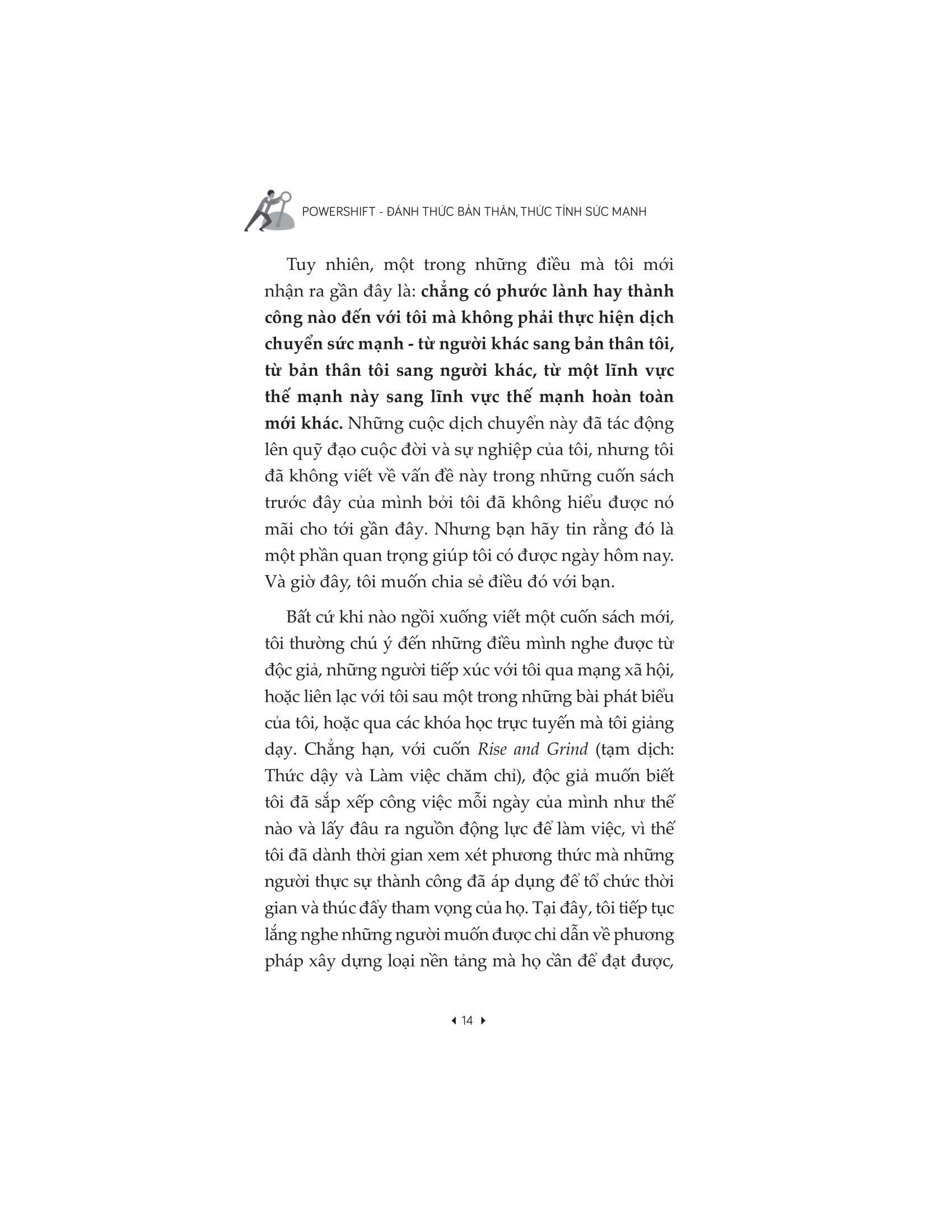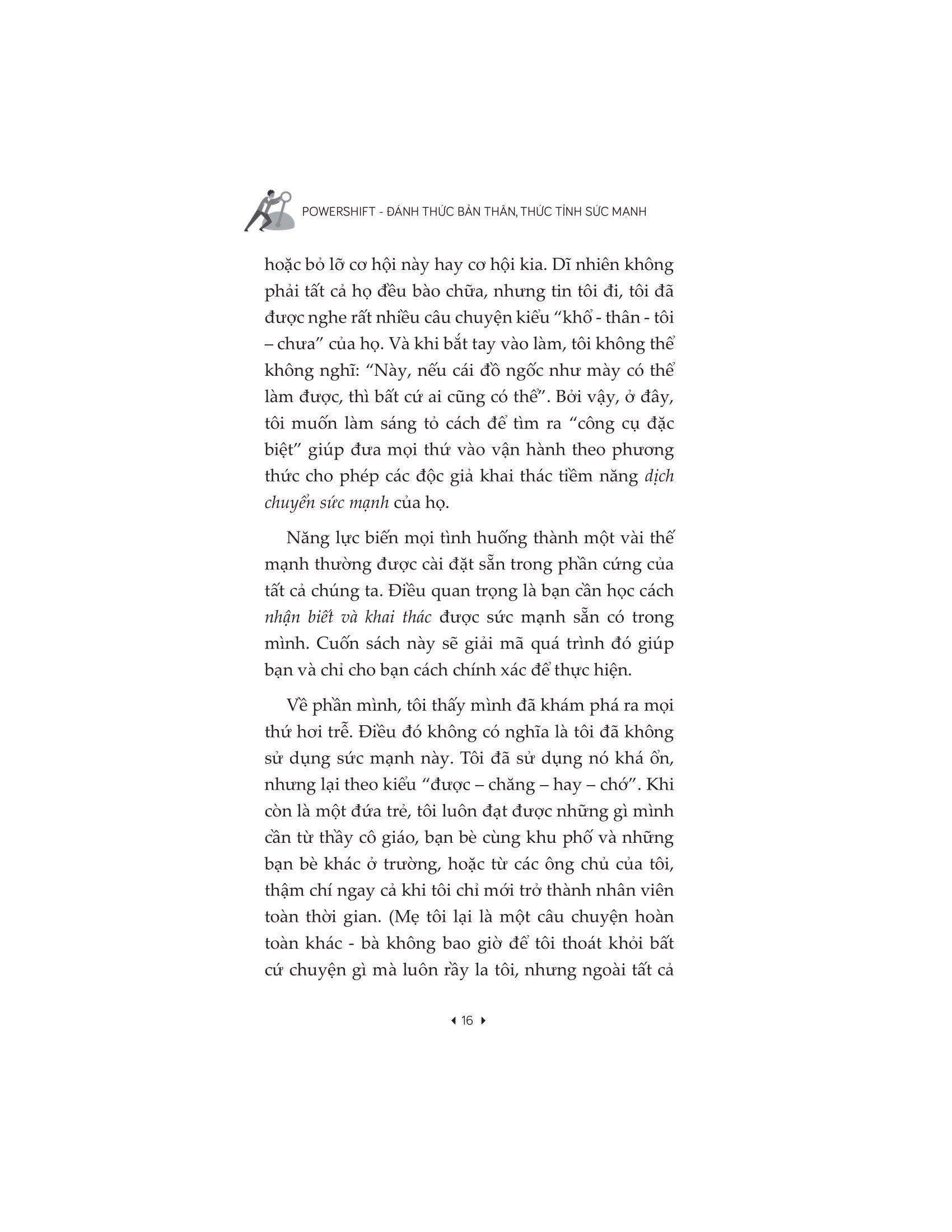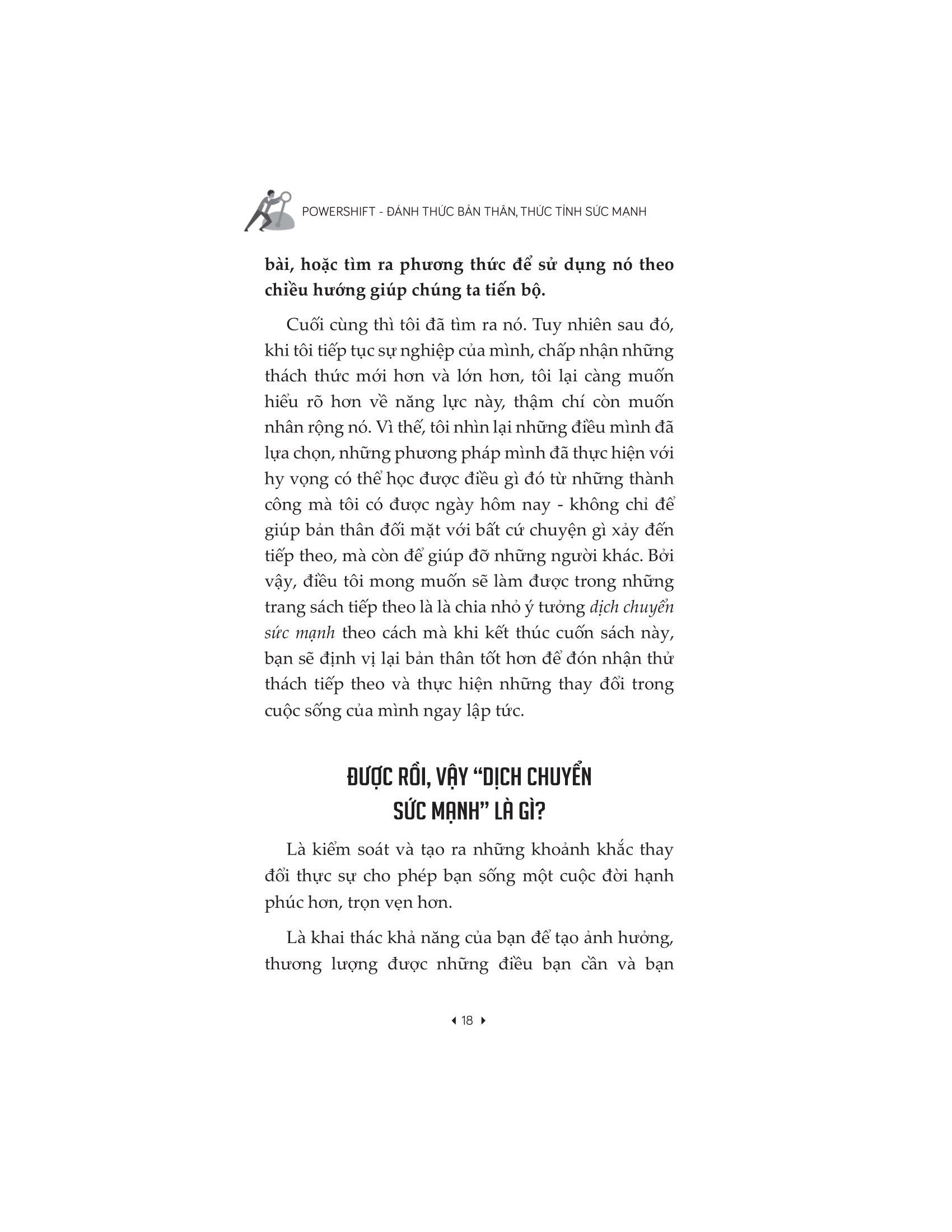 Powershift - Đánh Thức Bản Thân - Thức Tỉnh Sức Mạnh Bạn đã bao giờ muốn tạo ra một sự thay đổi lớn trong cuộc đời m.ình nhưng không biết bắt đầu từ đâu? Trong POWERSHIFT, Daymond John - Ngôi sao từ chương trình Shark Tank Mỹ - sẽ chia sẻ câu trả lời. Để kiểm soát số phận của m.ình và thúc đẩy sự thay đổi mà bạn muốn thấy, bạn cần đặt nền móng để sẵn sàng nắm bắt mọi cơ hội đến với m.ình. Và điều đó có nghĩa là làm chủ: