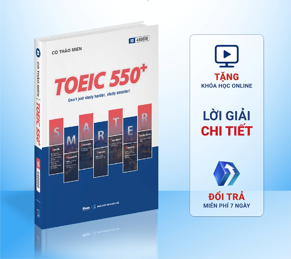 Sách - Toeic 550+ (Moonbook) Tác giả: Cô Thảo Miên Số Trang: 423 trang Kích thước: 19x27 cm Nhà xuất bản Dân Trí Nhà phát hành: Công ty cổ phần công nghệ trực tuyến Aladanh