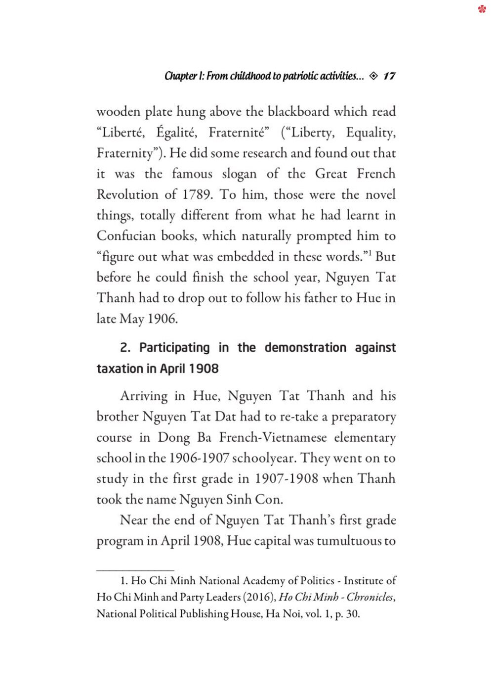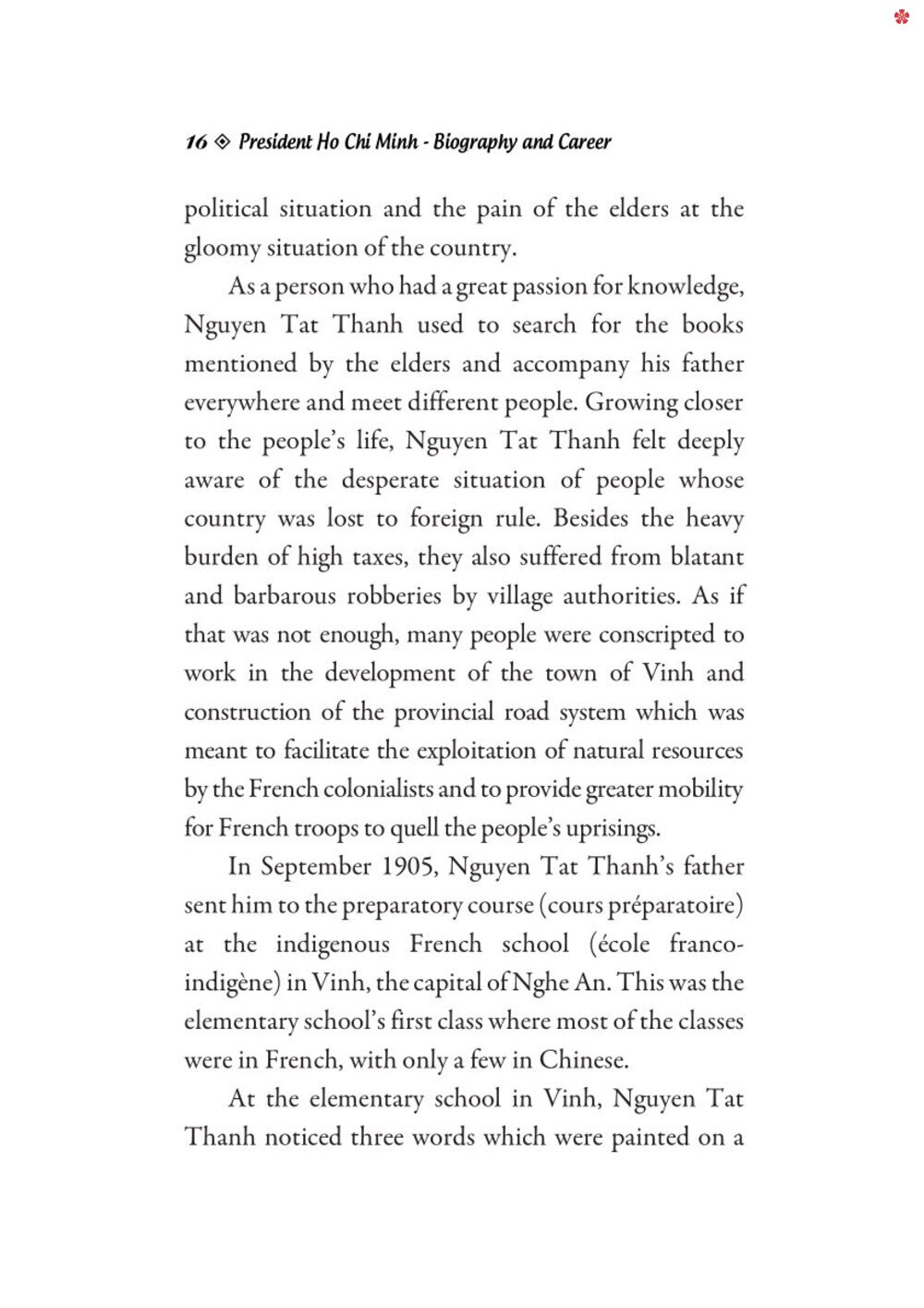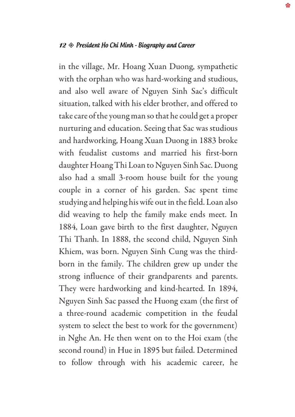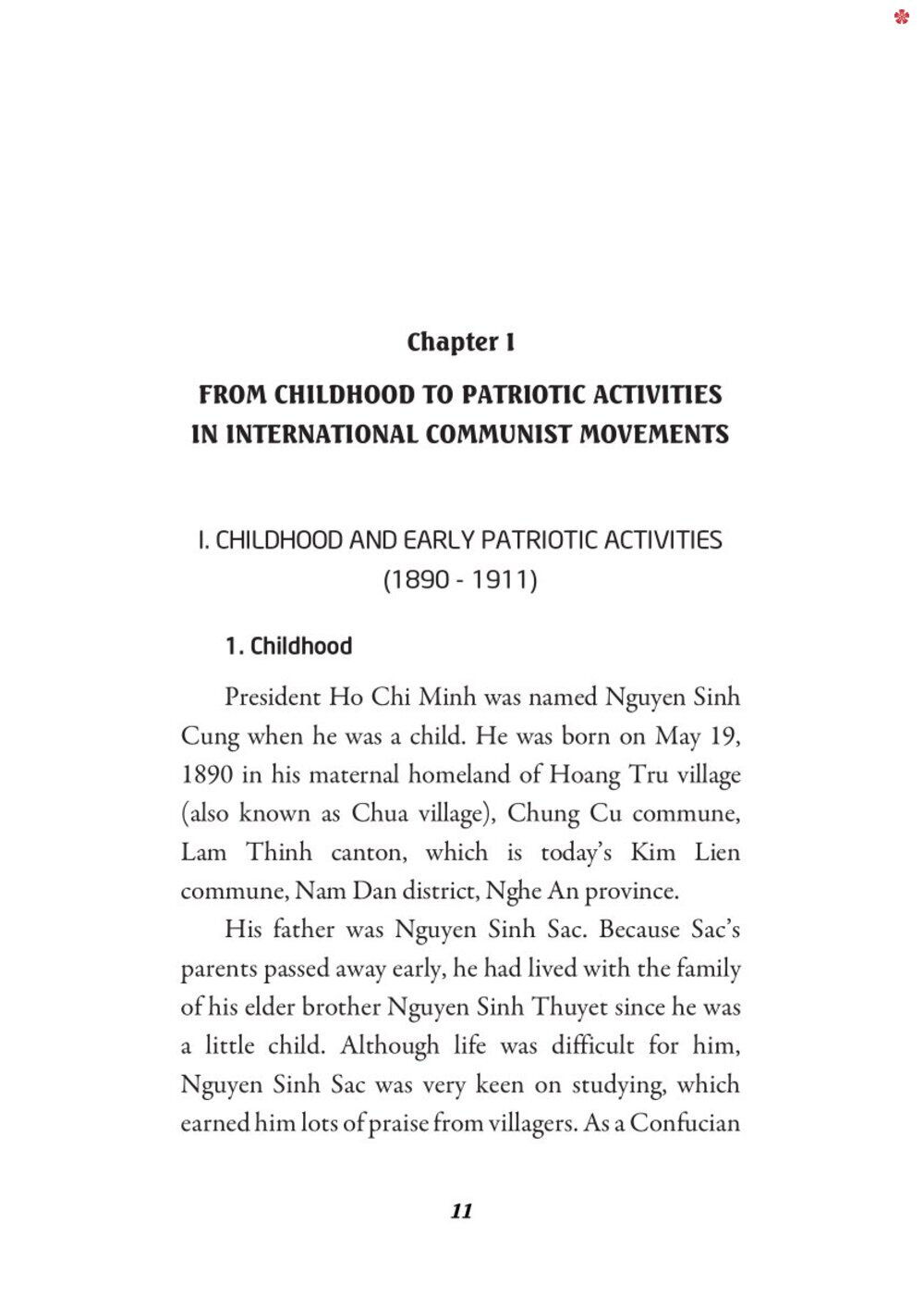 Ho Chi Minh is a great symbol of true patriotism in harmony with proletarian internationalism. He has devoted his entire life to his homeland and people, leaving behind a bright example of a great man with great mind and great courage. There have been numerous works on Ho Chi Minh's life, revolutionary career, thought, morality, and style in Vietnamese and other languages. Among them, the book President Ho Chi Minh - Biography and Career compiled and organized for translation by Ho Chi Minh’s Vestige in the Presidential Palace Area is a valuable work containing most of the essential information that many readers in Viet Nam and abroad desire to learn about Nguyen Ai Quoc - Ho Chi Minh.