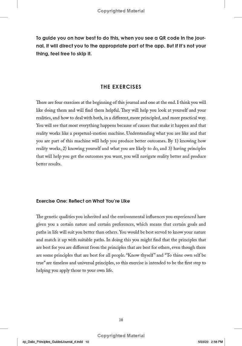 With this new journal, Dalio takes his goal one step further to help readers reflect on and record their own principles. He does that by providing a series of guided exercises and questions for reflecting on what you’re like, what you value, and what principles will best help you achieve your goals. These exercises draw from key concepts in the original Principles book, including: