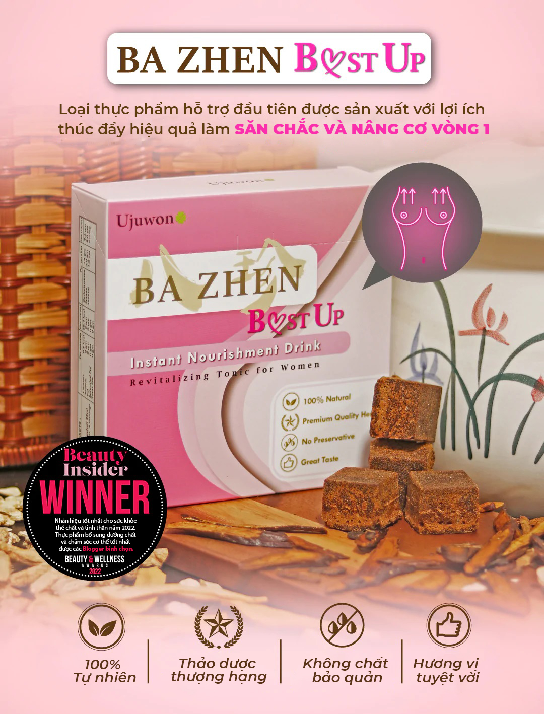 Nước uống thảo mộc Ba Zhen Ujuwon Bust Up Tăng cường vòng 1, sắc vóc ngọc ngà (8 gói/hộp) Ujuwon Ba Zhen Bust Up (còn gọi là Bát Trân thang của người Đài Loan) là loại thuốc bổ giúp phục hồi sức khỏe là loại thuốc bổ cho phái nữ hàng đầu Đài Loan, được điều chế từ các loại thảo mộc thượng hạng với lợi ích tăng cường hiệu quả làm săn chắc và nâng vòng 1 dành cho phái nữ. Bát Trân Thang nay đã có thể dùng ngay tức thì được đóng gói tiện lợi dành cho những người phụ nữ hiện đại. Bạn muốn bồi bổ cơ thể nhưng lại sợ nóng trong người?