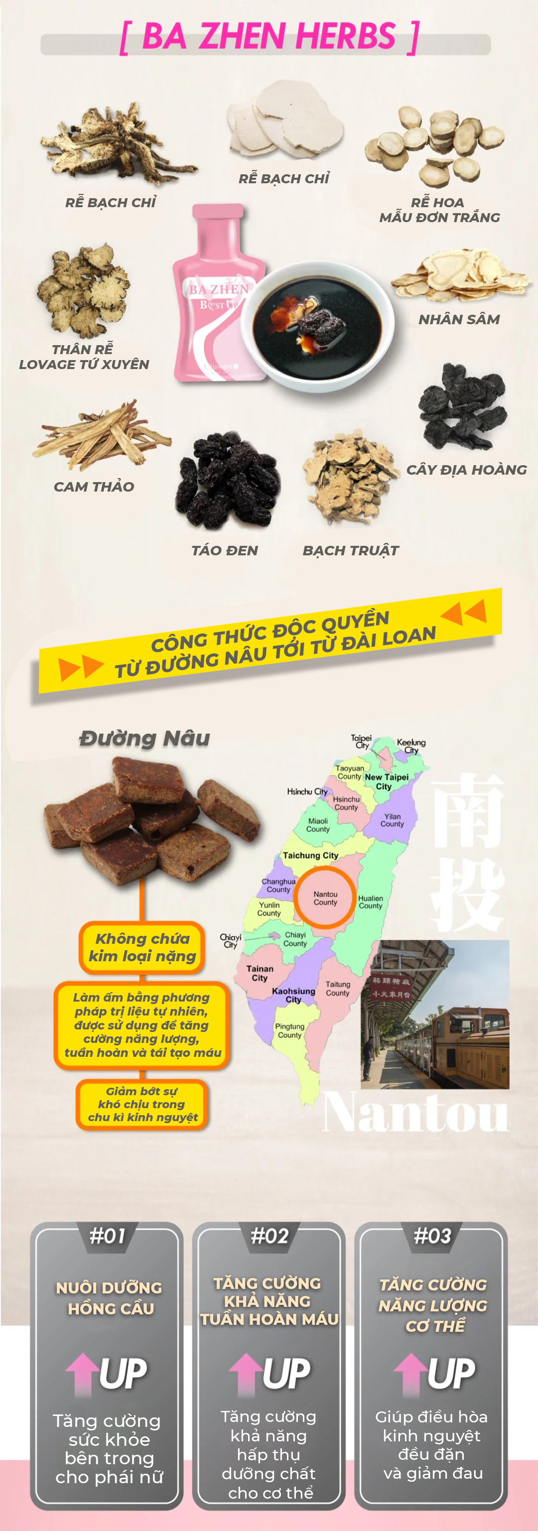 - Công thức độc quyền Từ thảo mộc của Ujuwon Ba Zhen + đường nâu ủ thủ công từ Đài Loan.