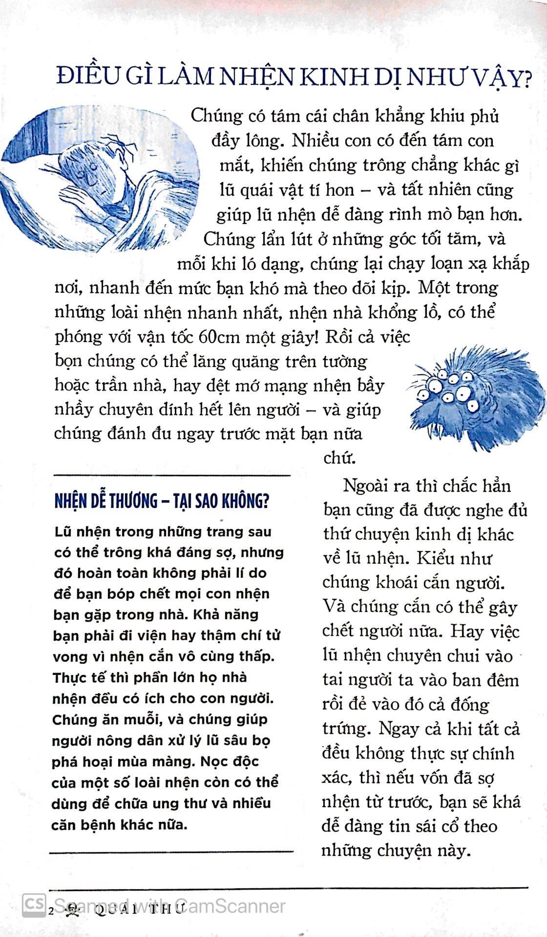 Mua tại TiktokCuốn bách khoa về những thứ con người sợ hãi, từ nhện cho đến ma quỷ, phù thủy, người sói. cầu cơ, xác sống... Nêu rõ nguồn gốc, nguyên nhân lẫn xuất xứ và thêm vào những thông tin cho thấy thực tế chúng không quá đáng sợ, chỉ là con người bị sợ hãi theo đám đông, hay theo một hội chứng khoa học nào đó. Với thông tin không thể chi tiết hơn nữa, hình minh họa đủ dọa khối người và giọng điệu hài hước cùng những trò lừa dọa dẫm cho người đọc áp dụng trong dịp Halloween, Quái thư là một thử thách thú vị cho những bạn đọc thích thể loại bí ẩn, sinh vật huyền bí và khối thứ liên quan đến ma quái.