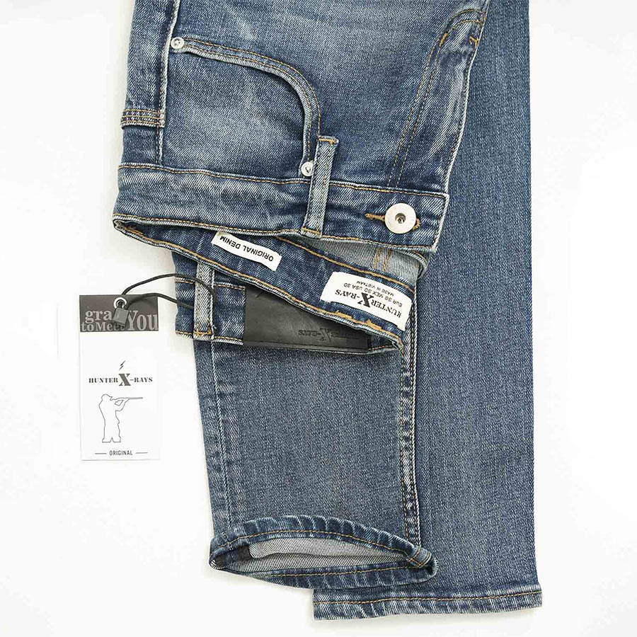 Quần Jeans Nam Cao Cấp HUNTER X-RAYS Form Slimfit Thun Màu Xanh Phủ Dơ NhẹD33 Đặc điểm nổi bật: Nút được đúc nguyên khối bằng đồng và nổi bật thương hiệu HUNTER X-RAYS đảm bảo