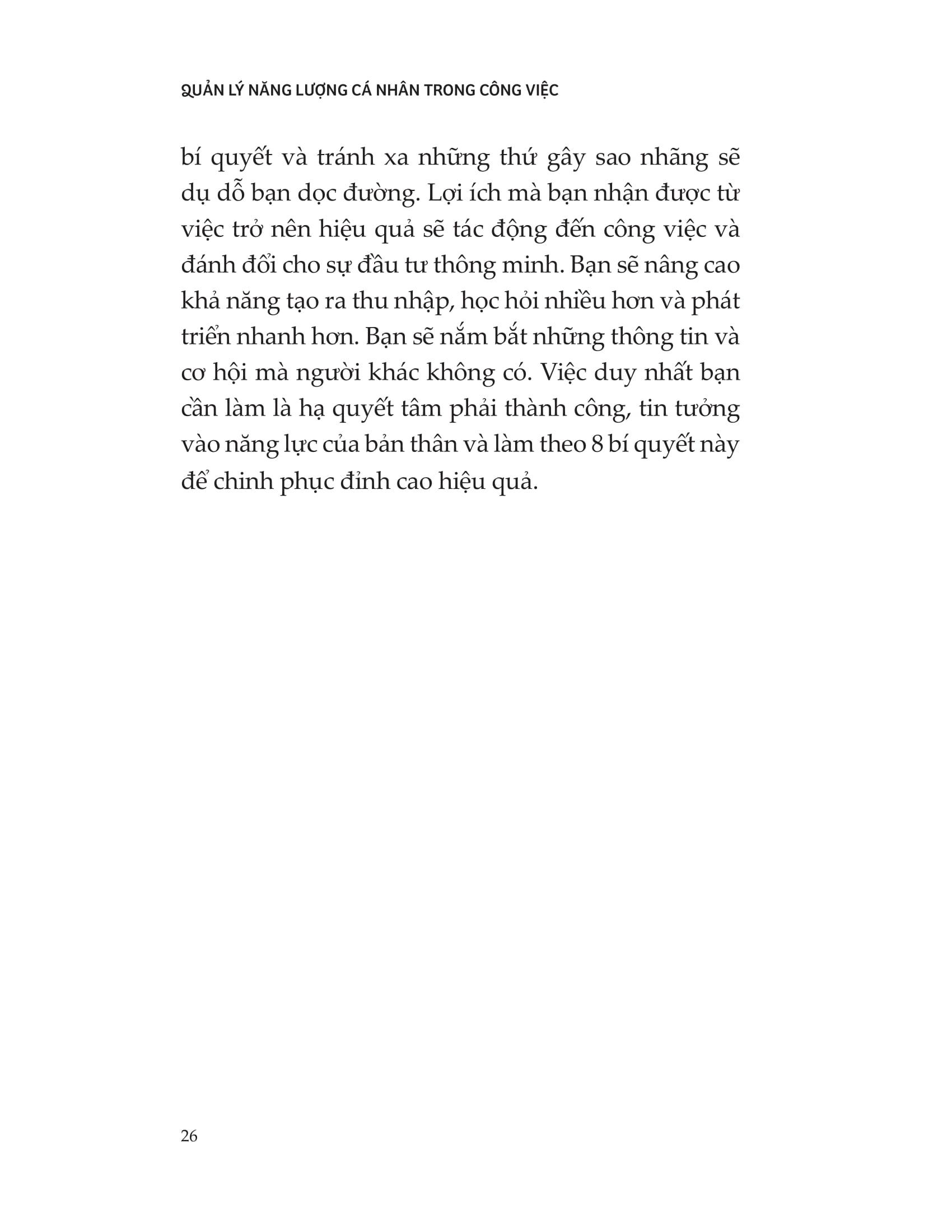 Trong cuốn sách này, Marc Effron - chuyên gia về quản lý tài năng và tác giả sác bán chạy, với cách tiếp cận đặc trưng vô cùng đơn giản lấy khoa học làm nền tảng, xác định những yếu tố quan trọng nhất và chỉ cho chúng ta thấy làm thế nào để tận dụng tối ưu thời gian và năng lượng cá nhân để cải thiện và đẩy bật hiệu suất. Rõ ràng hiệu suất cao là kết quả cuối cùng từ tổng hợp nhiều yếu tố, và một vài yếu tố trong đó nằm ngoài khả năng kiểm soát hay thay đổi của chúng ta. Effon chỉ ra 8 yếu tố và từ đó khuyến khích chúng ta tạo thành 8 thói quen để kiểm soát và thực hành những phương pháp thực tế và hữu dụng để chúng ta có cải thiện những yếu tố nằm trong khả năng kiểm soát của chúng ta.