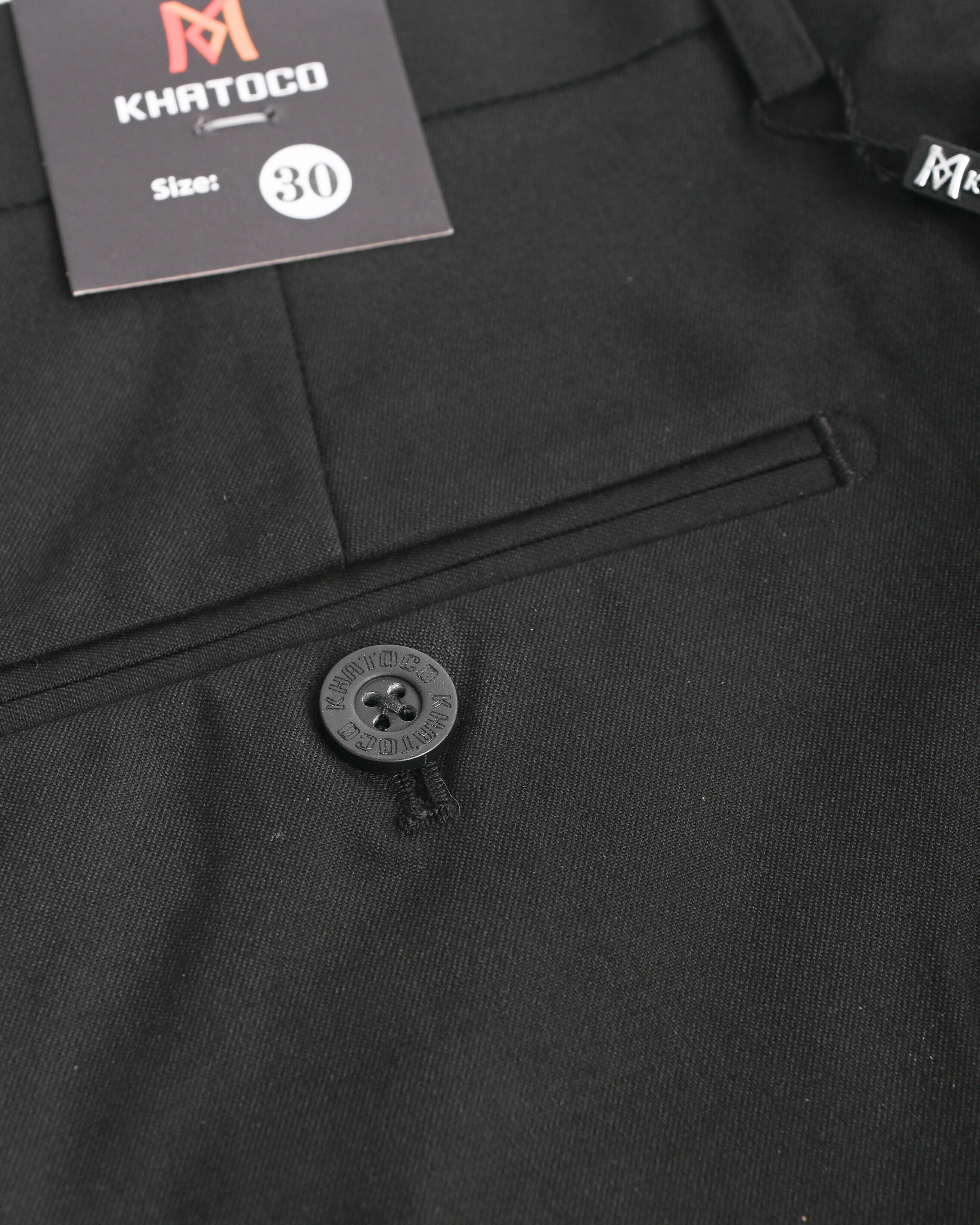 Mô tả sản phẩm – Quần tây nam Khatoco không ly màu đen Chất liệu cao cấp - Thành phần: 70% Terylon, 30% Rayon. - Vải mềm mịn, thoáng khí, bền màu và hạn chế