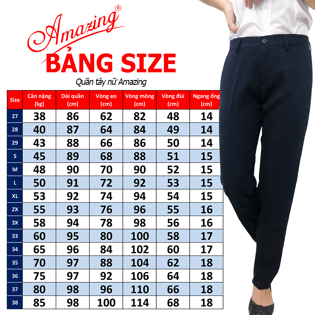 - Bài này đăng bán quần, bạn cần thêm áo sơ mi nữ trắng, xem thêm trong shop nhé này nhé : Thông số thành phẩm: Size Cân nặng Dài quần Vòng eo Vòng mông (Kg) (cm) (cm) (cm) 27 35 86 62 82 28 40 87 64 84 29 43 88 66 86 S 45 89 68 88 M 48 90 70 90 L 50 91 72 92 XL 53 92 74 94 2XL 55 93 76 96 3XL 58 94 78 98 4XL 60 95 80 100 5XL 65 96 82 102