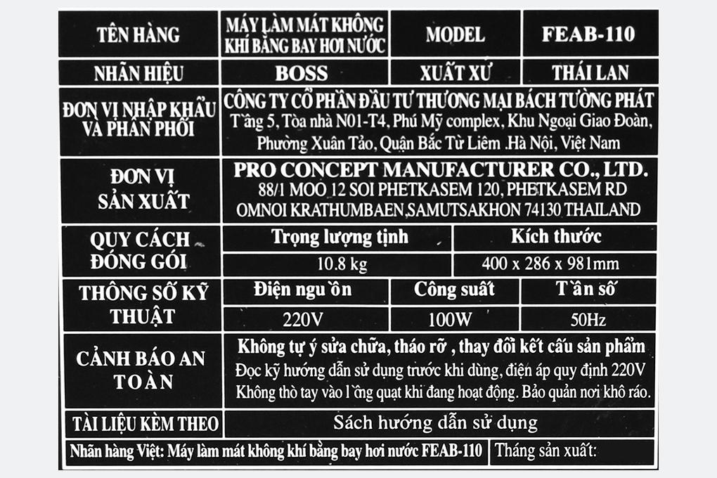 - Dung tích bình nước: 45L - Lưu lượng gió: 5.500m3/h - Kích thước: 470mm x 380mm x 990mm - Điện Áp: AC 220v-240V/50Hz - Công suất: 90W - Trọng lượng : 14.5 Kg