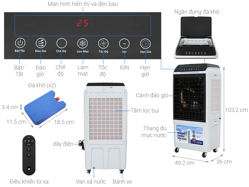 • Tiện ích: Có hộp đá khô làm mát Tạo ion lọc không khí Điều khiển từ xa Tự ngắt bơm khi cạn nước Hẹn giờ tắt Có màn hình hiển thị Có thang đo hiển thị mực nước Có van xả cặn khoang chứa nước Có bánh xe di chuyển Đảo chiều gió tự động Thông tin lắp đặt
