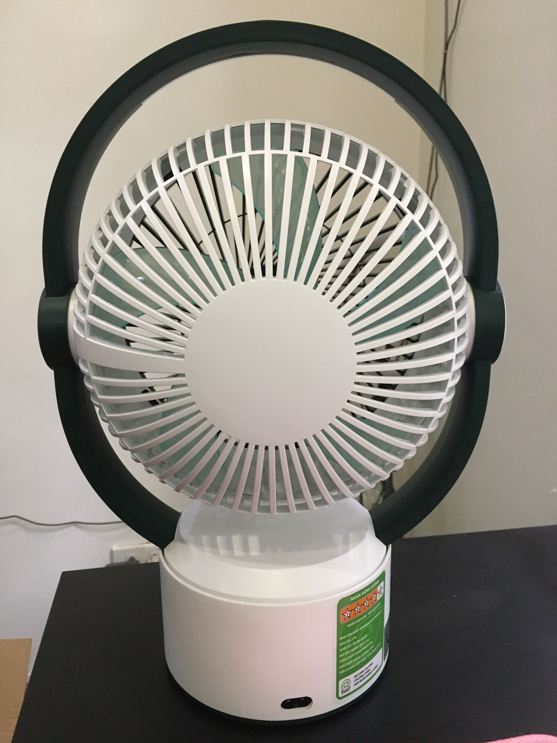Thông số kĩ thuật: - Công suất 4W - Pin lithium-ion 3.7V 2000mAh - Điện áp 5V DC - Kích thước lồng quạt: 10.5 cm - 3 tốc độ - Thời gian sạc: 3-4h -