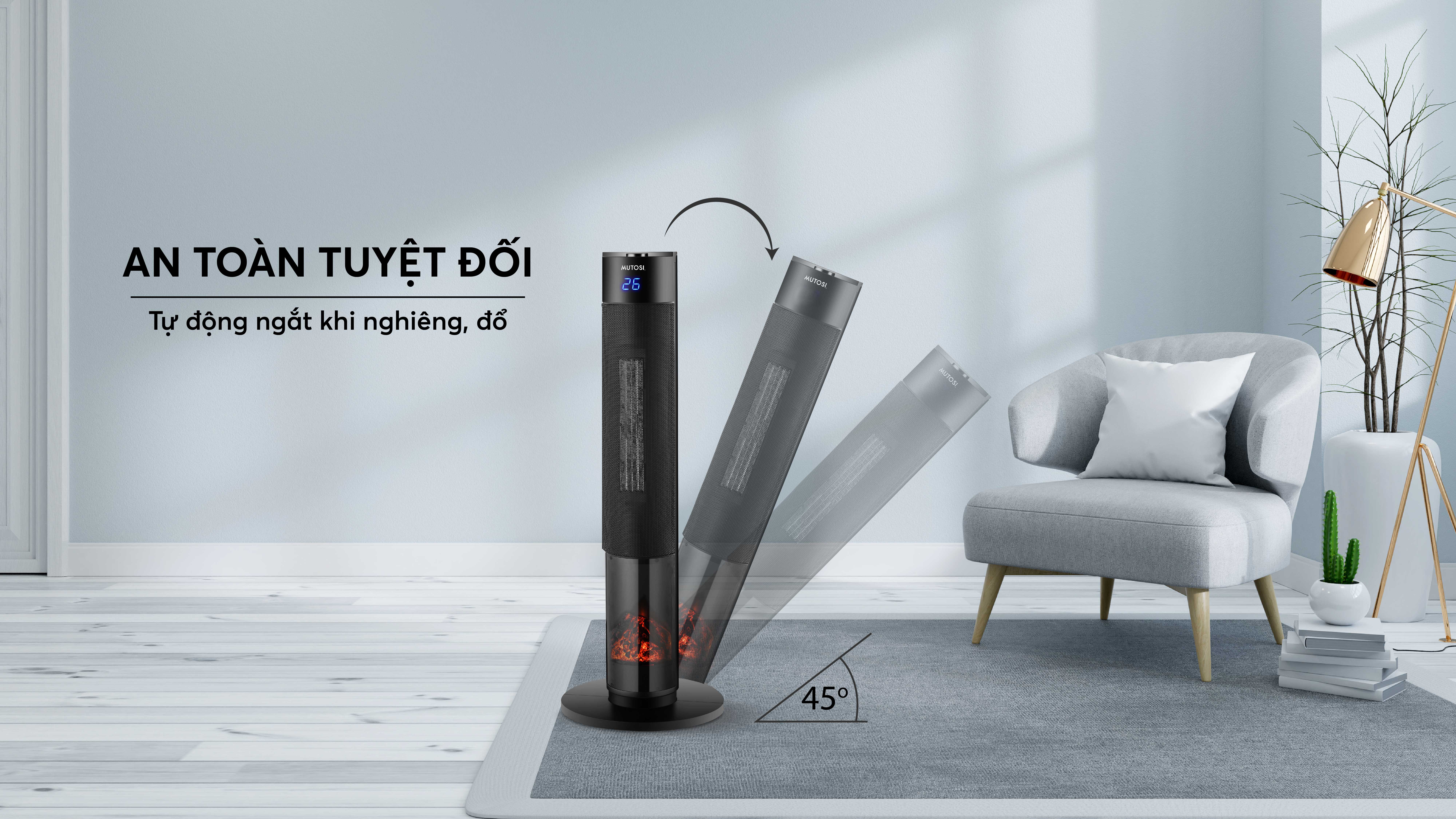 Quạt sưởi Mutosi MCH-2000L an toàn tuyệt đối khi sử dụng nhờ được trang bị rơ-le cảm biến có khả năng tự động ngắt khi nghiêng/đổ. Tích hợp tính năng tự động ngắt khi quá nhiệt, quạt sưởi sẽ tự động ngắt nguồn điện khi điện áp tăng cao và nhiệt độ cao bất thường, đảm bảo không xảy ra các sự cố chập cháy điện.