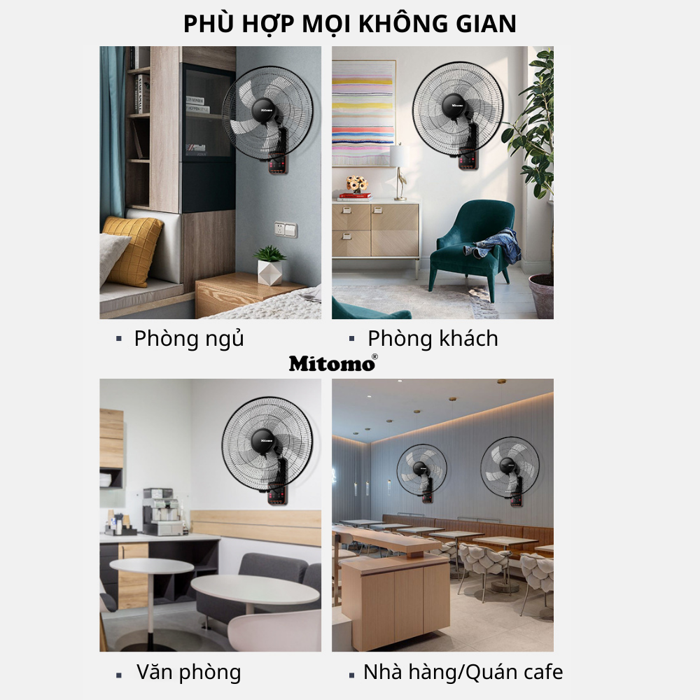 - THÔNG SỐ VÀ TÍNH NĂNG CỦA QUẠT TREO TƯỜNG MITOMO FTT-60AEN Quạt treo tường Mitomo được thiết kế đơn giản, hiện đại với tông màu đen chủ đạo. Thân quạt làm từ nhưa ABS cao cấp, lòng quạt làm từ thép mang lại vẻ sang trọng và chắc chắn. Quạt tích hợp nút nhấn điều khiển trên thân máy và điều khiễn từ xa tiện dụng. Ba cấp độ gió cùng tính năng xoay đa hướng giúp gió phủ rộng và đều hơn. Tính năng nổi bật của quạt treo Mitomo chính hãng bảo hành 2 năm