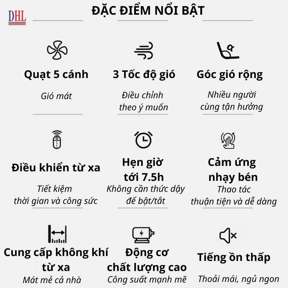 Sải cánh: 40cm Công suất: 55W Hệ số tiết kiệm năng lượng: 1,32 Điều chỉnh tốc độ: Điều Khiển Từ Xa Cầu chì chống cháy nổ: Có Lưu lượng gió: 77.7 m3/phút 3 Cánh quạt