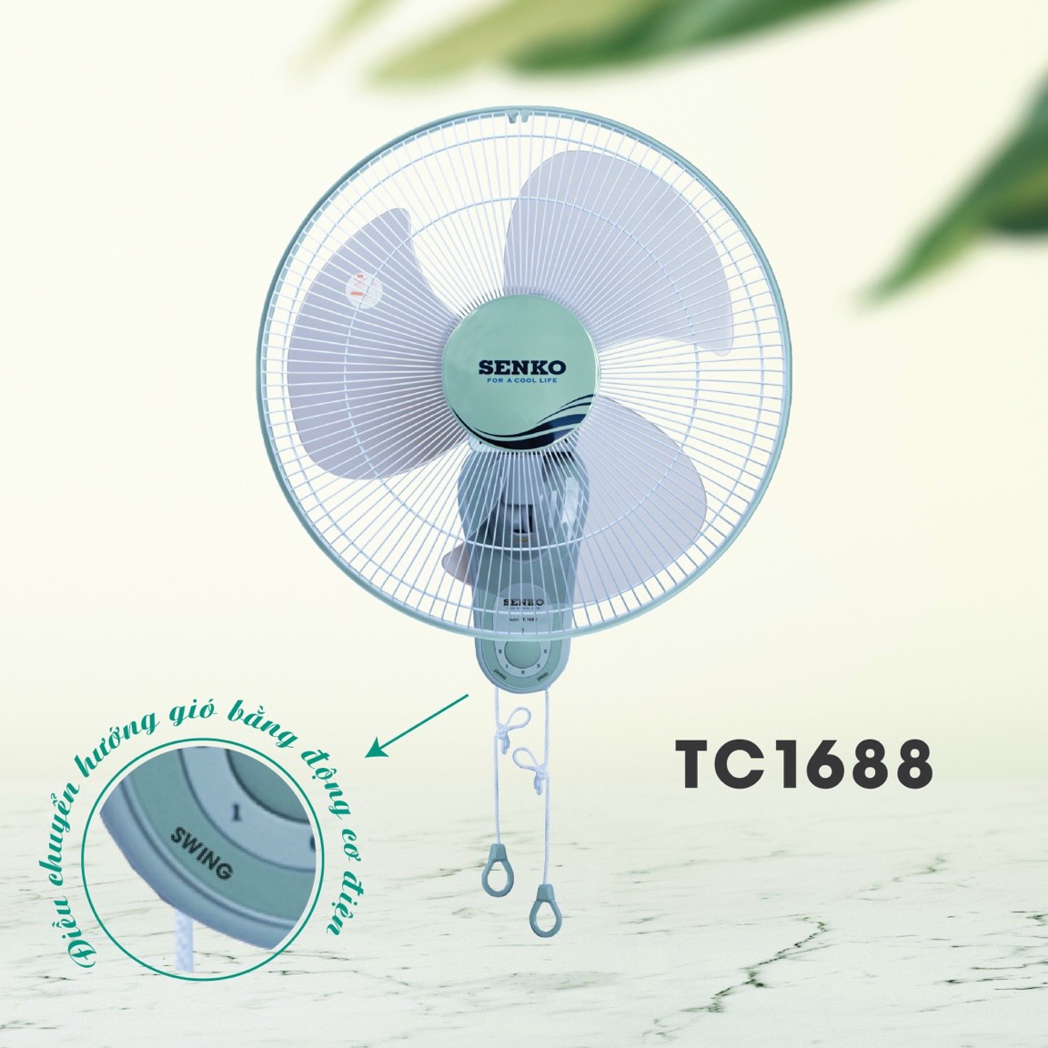 Quạt treo 2 dây SENKO TC1626 Công suất 47W 3 tốc độ gió điều chỉnh bằng dây kéo Đường kính cánh: 40cm Loại motor: Bạc thau Thiết kế treo tường tiết kiệm không gian -