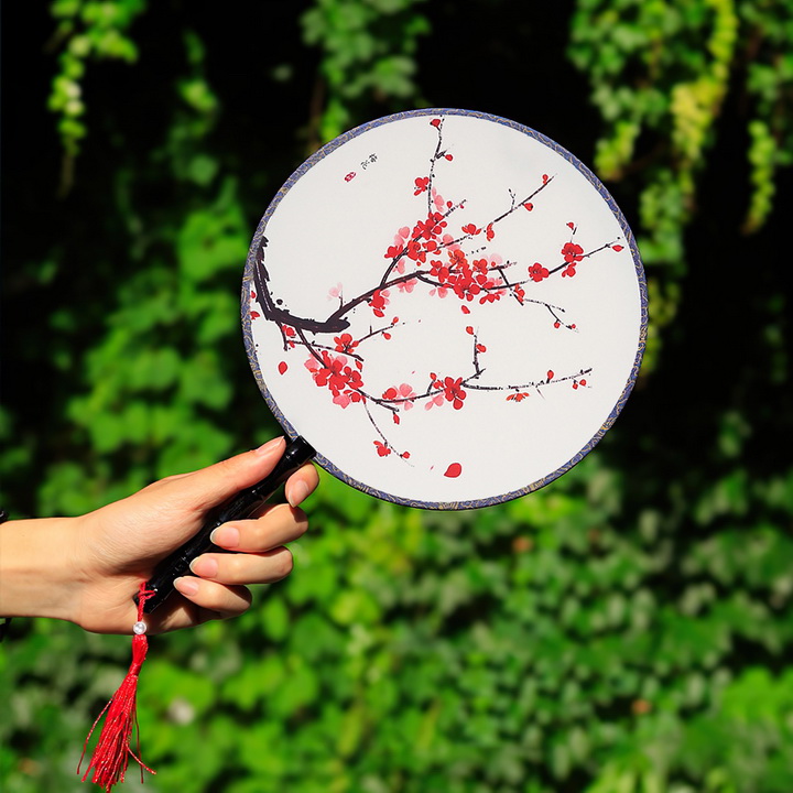 Quạt tròn cổ trang hoa mai đỏ loại nhỏ đường kính 21cm