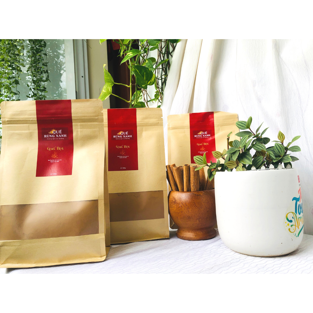 Bên trong, bột quế được đóng trong túi giấy kraft sạch sẽ thân thiện với môi trường, hàn kín miệng để giữ nguyên mùi. Bên ngoài, được dán tem chính hãng của Quế Rừng Xanh, an tâm sử dụng.