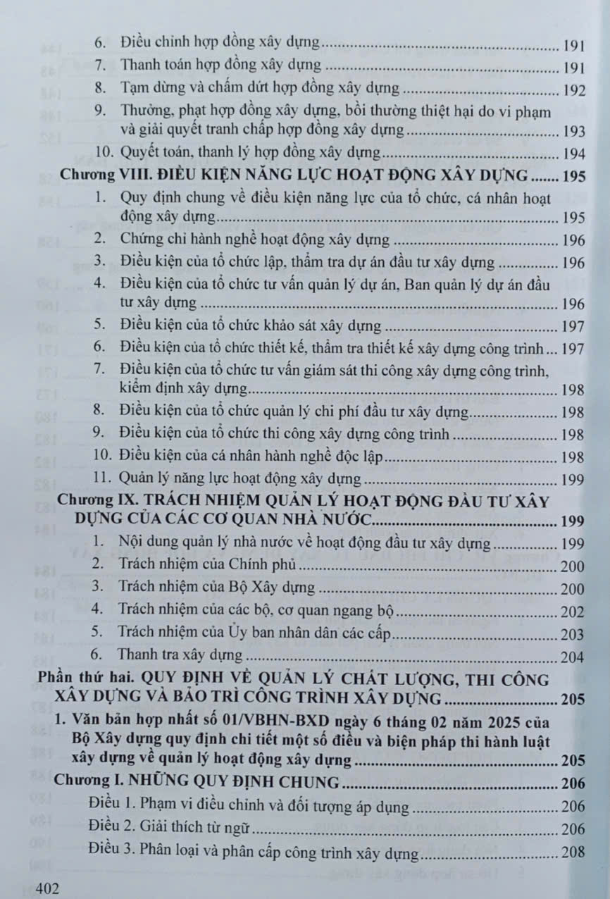 Thời gian qua Quốc hội, Chính phủ và Bộ ngành đã ban hành nhiều văn bản Luật liên quan đến Luật Xây dựng và nhiều Nghị định mới như: Nghị định số 175/2024/NĐ-CP ngày 30 tháng 12 năm 2024 quy định chi tiết một số điều và biện pháp thi hành Luật Xây dựng về quản lý hoạt động xây dựng. Thông tư số 10/2024/TT-BXD ngày 01 tháng 11 năm 2024 của Bộ Xây dựng về quản lý chất lượng sản phẩm, hàng hóa vật liệu xây dựng. Thông tư số 02/2024/TT-BXD ngày 20 tháng 5 năm 2024 của Bộ Xây dựng hướng dẫn xác định và quản lý chi phí quy hoạch chi tiết theo quy trình rút gọn… Nhằm có tài liệu tuyên truyền những quy định pháp luật mới trên đến các cơn quan, đơn vị, doanh nghiệp và cá nhân liên quan có tài liệu tham khảo áp dụng trong công việc Nhà xuất bản Hồng Đức xuất bản cuốn sách: