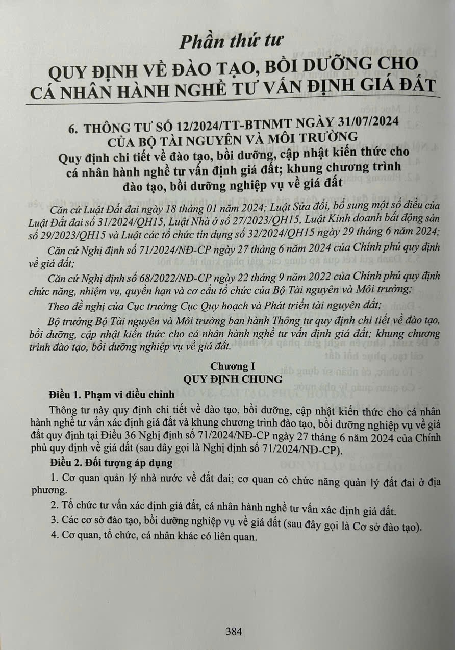 Phần thứ tư. QUY ĐỊNH VỀ ĐÀO TẠO, BỒI DƯỠNG CHO CÁ NHÂN HÀNH NGHỀ TƯ VẤN ĐỊNH GIÁ ĐẤT