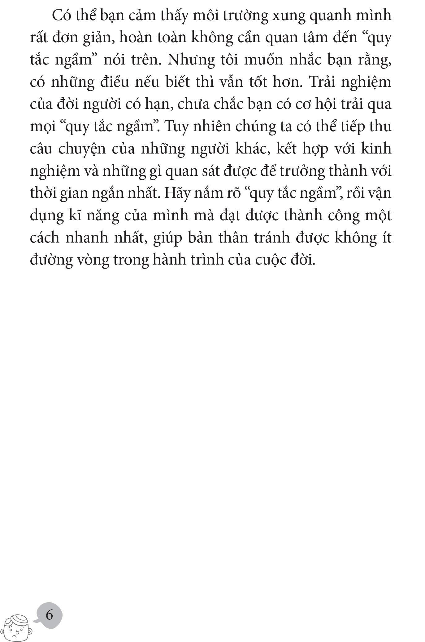 Có thể bạn cảm thấy môi trường xung quanh mình rất đơn giản, hoàn toàn không cần quan tâm đến “quy tắc ngầm” nói trên. Nhưng tôi muốn nhắc bạn rằng, có những điều nếu biết thì vẫn tốt hơn. Trải nghiệm của đời người có hạn, chưa chắc bạn có cơ hội trải qua mọi “quy tắc ngầm”. Tuy nhiên chúng ta có thể tiếp thu câu chuyện của những người khác, kết hợp với kinh nghiệm và những gì quan sát được để trưởng thành với thời gian ngắn nhất. Hãy nắm rõ “quy tắc ngầm”, rồi vận dụng kĩ năng của mình mà đạt được thành công một cách nhanh nhất, giúp bản thân tránh được không ít đường vòng trong hành trình của cuộc đời.