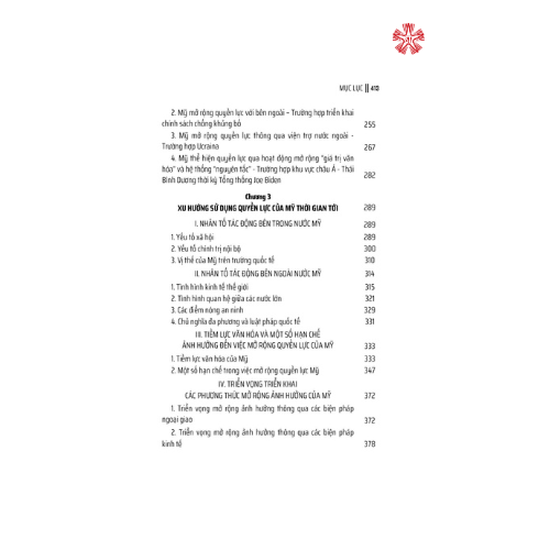Mua tại TiktokVới cách tiếp cận đi từ lý luận đến thực tiễn, nội dung sách được bố cục thành ba chương, xem xét vấn đề quyền lực qua nhiều học thuyết trong quan hệ quốc tế, làm rõ nhận thức và quan niệm của người Mỹ về quyền lực và cách thức nước Mỹ mở rộng quyền lực trên toàn cầu. Trên cơ sở phân tích những bằng chứng thực tiễn, nhóm tác giả đã chỉ ra các nhân tố tác động đến phương thức Mỹ sử dụng quyền lực trong quan hệ đối ngoại, từ đó dự báo một số xu hướng Mỹ sẽ triển khai nhằm duy trì và mở rộng ảnh hưởng trong quan hệ quốc tế.
