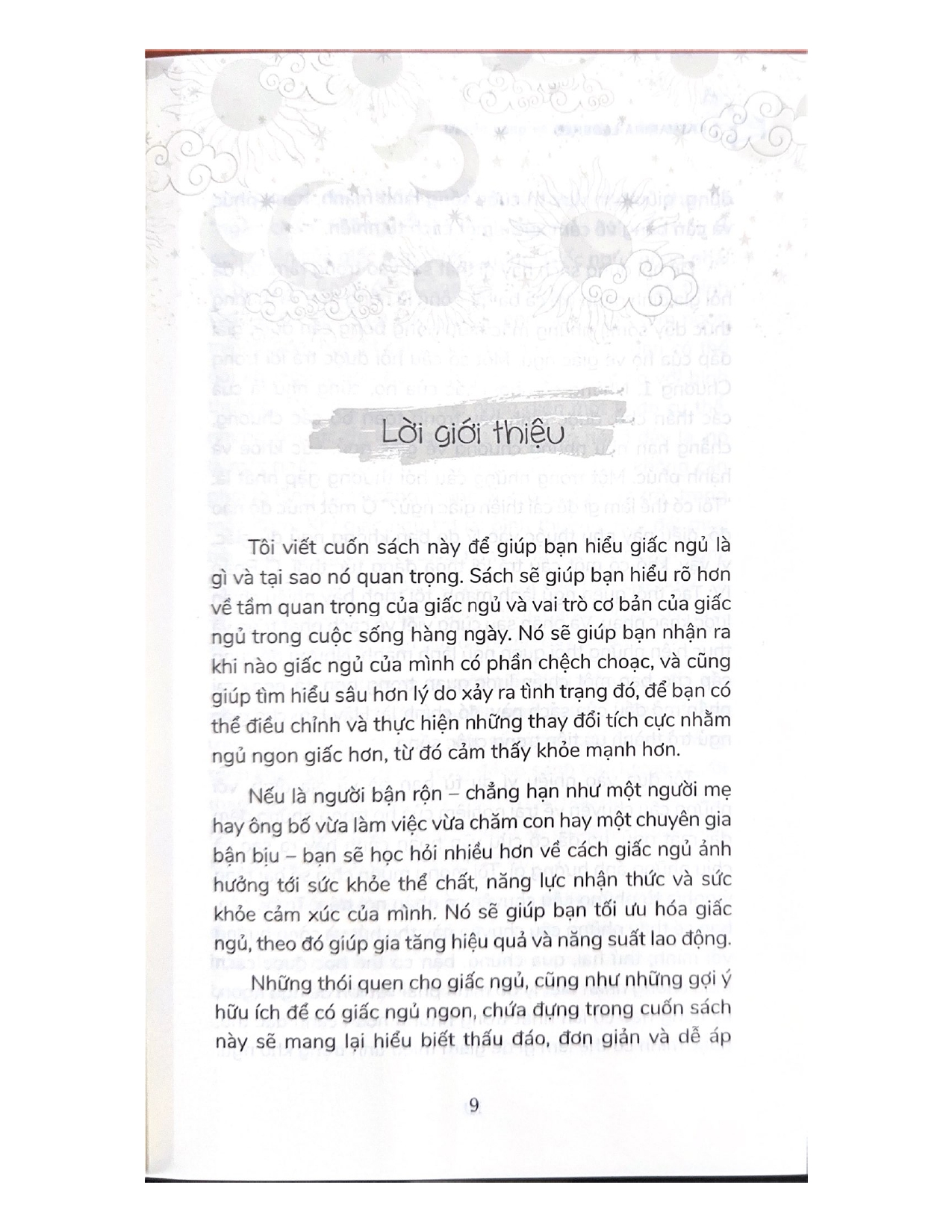 - Giới thiệu Quyền Năng Vô Hạn Của Giấc Ngủ Có lòng can đảm đối với những nỗi buồn lớn của cuộc sống và kiên nhẫn đối với những điều nhỏ nhặt và khi bạn đã hoàn thành công việc hàng ngày của mình một cách chăm chỉ, hãy đi ngủ trong yên bình. Victor Hugo Một cuốn sách rất thú vị! Từ quá trình nghiên cứu và kinh nghiệm làm việc, Katharina Lederle đã giải thích những kiến thức khoa học mới nhất về giấc ngủ, cũng như lý do tại sao giấc ngủ ngon lại quan trọng đối với sức khỏe và niềm hạnh phúc của chúng ta. Cách tiếp cận thực tế đầy thu hút này giúp việc đặt ưu tiên lên giấc ngủ và làm theo lời khuyên của bà trở nên dễ dàng – chúng là sự kết hợp giữa khoa học và thường thức. Tôi khuyên các bạn nên đọc nó!