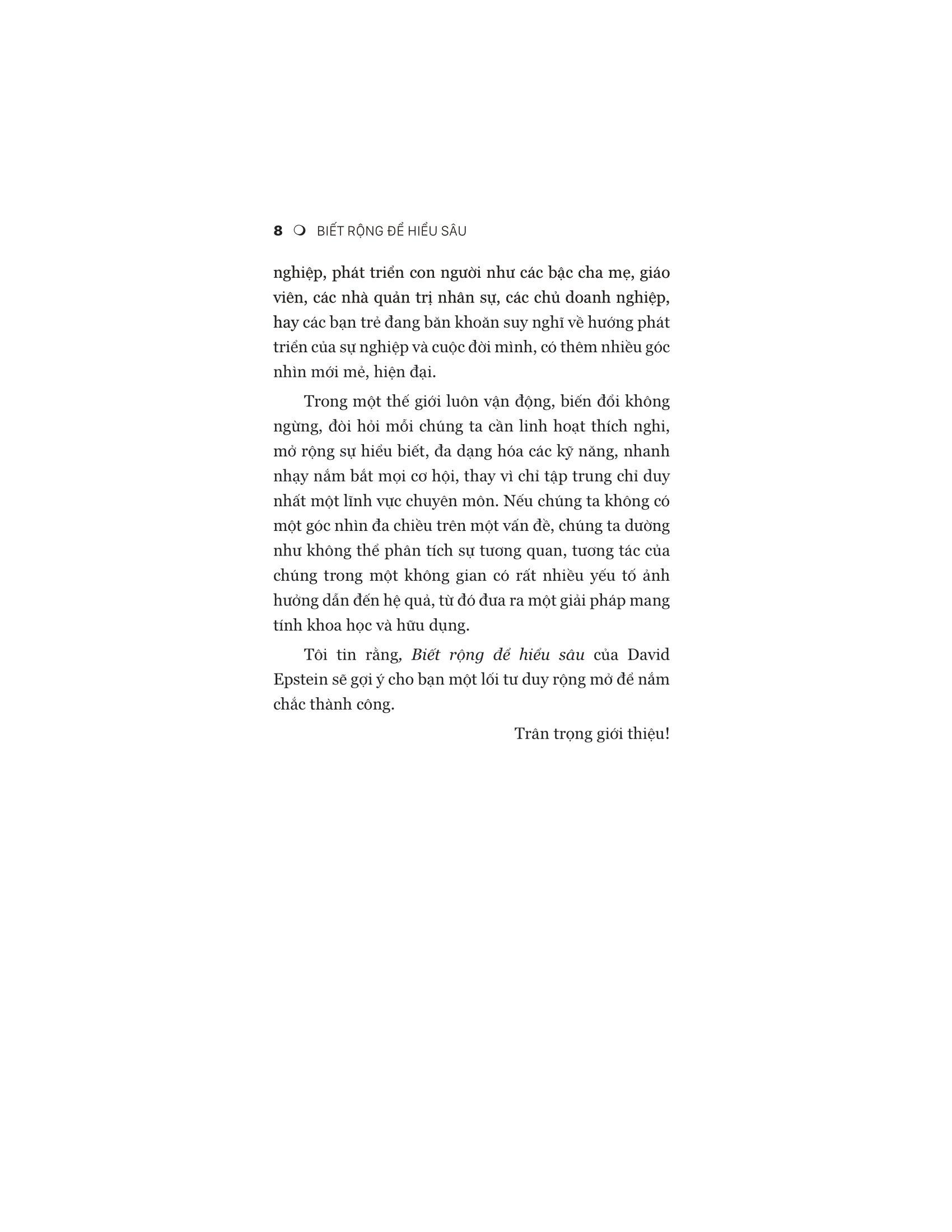 David Epstein đã kiểm tra các vận động viên, nghệ sĩ, nhạc sĩ, nhà phát minh, nhà dự báo và nhà khoa học thành công nhất thế giới. Ông phát hiện ra rằng trong hầu hết các lĩnh vực – đặc biệt là những lĩnh vực phức tạp và khó đoán – những người có tư duy tổng quát (chứ không phải chuyên gia) đều có tố chất xuất sắc. Những người theo chủ nghĩa tổng quát thường tìm ra con đường của m.ình muộn và họ có nhiều mối quan tâm hơn là tập trung vào một. Họ cũng sáng tạo hơn, nhanh nhẹn hơn và có thể tạo ra những kết nối mà những đồng nghiệp chuyên môn hóa không thể nhìn thấy.