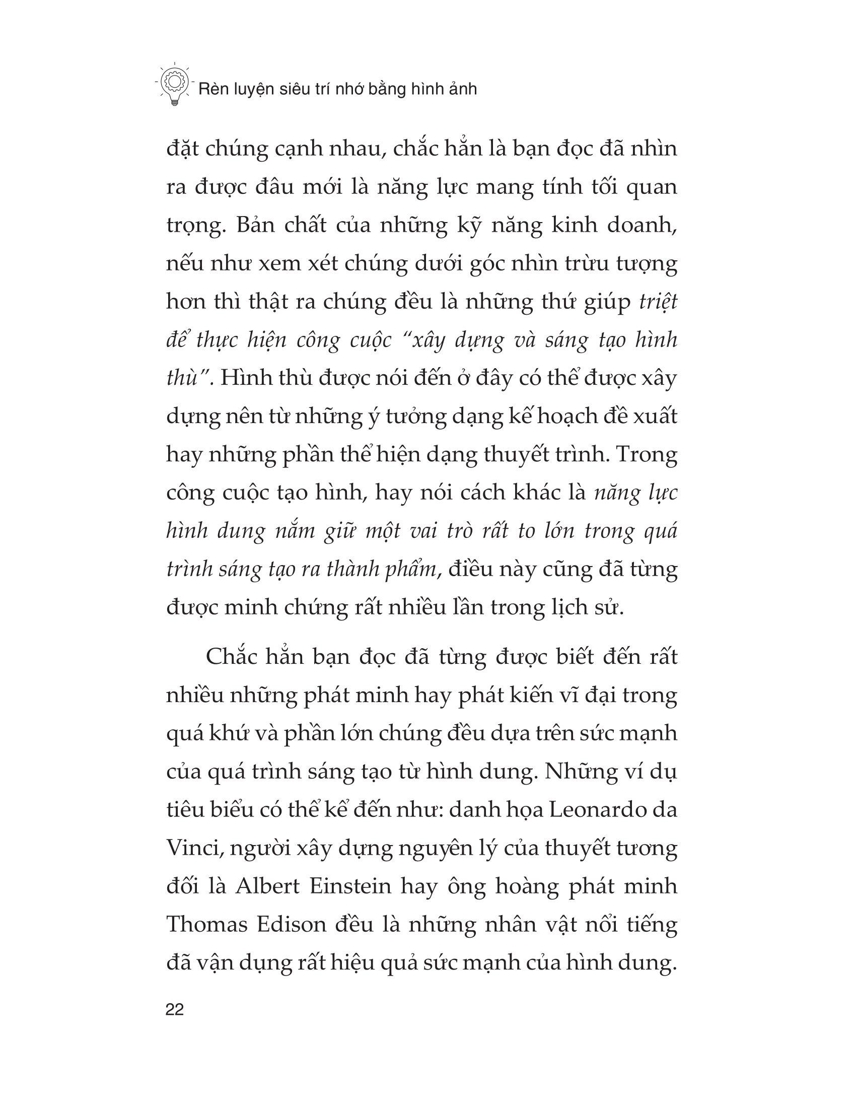 Cuốn sách Rèn luyện siêu trí nhớ bằng hình ảnh sẽ giải thích phương pháp xử lý hình ảnh và các kỹ thuật phân tách, chuyển đổi và liên kết thông tin sao cho dễ nhớ để ai cũng làm được và giúp bạn tối ưu hóa tiềm năng não bộ.