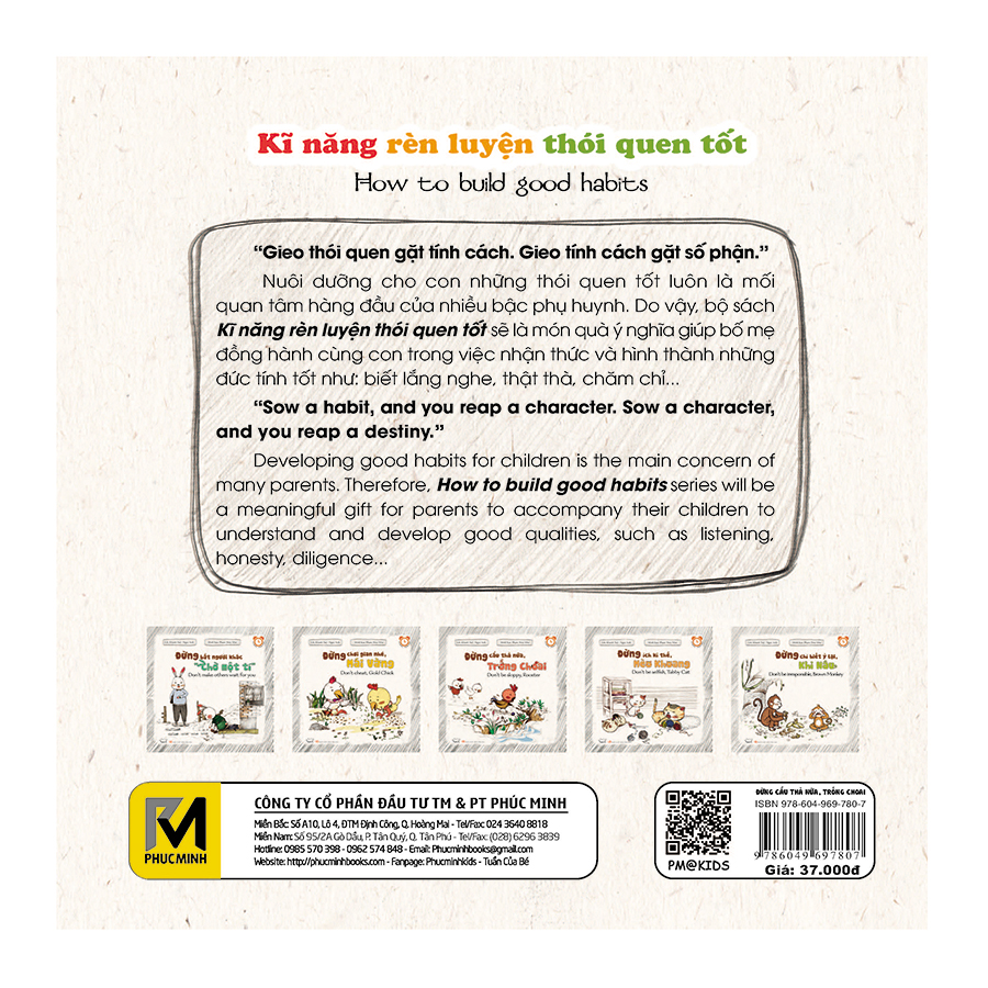 Nuôi dưỡng cho con những thói quen tốt luôn là mối quan tâm hàng đầu của cha mẹ. Do vậy, bộ sách Kĩ năng song ngữ Rèn luyện thói quen tốt sẽ là món quà ý nghĩa giúp bố mẹ đồng hành cùng con trong việc nhận thức và hình thành những đức tính tốt. Bộ sách Kĩ năng song ngữ Rèn luyện thói quen tốt bao gồm 5 tựa sách: Đừng bắt người khác “chờ một tí”; Đừng cẩu thả nữa, Trống Choai; Đừng chơi gian nhé, Mái Vàng; Đừng ích kỉ thế, Mèo Khoang; Đừng chỉ biết ỷ lại, Khỉ Nâu với những câu chuyện đơn giản, các nhân vật gần gũi, hình ảnh minh họa hiện đại, đẹp mắt sẽ giúp các bé rèn luyện những thói quen tốt, lành mạnh như biết lắng nghe, thật thà, chăm chỉ, biết quan tâm giúp đỡ người khác, biết tự làm những công việc đơn giản trong cuộc sống hàng ngày. Bộ sách sẽ là người bạn tốt để bồi dưỡng, xây đắp thói quen, tính cách, tâm hồn… cho bé yêu. Ngoài ra, bộ sách được biên soạn song ngữ Anh – Việt, giúp các bé làm quen với các từ, các câu tiếng Anh đơn giản, hàng ngày, giúp khơi gợi niềm hứng thú học ngoại ngữ cho các bé.