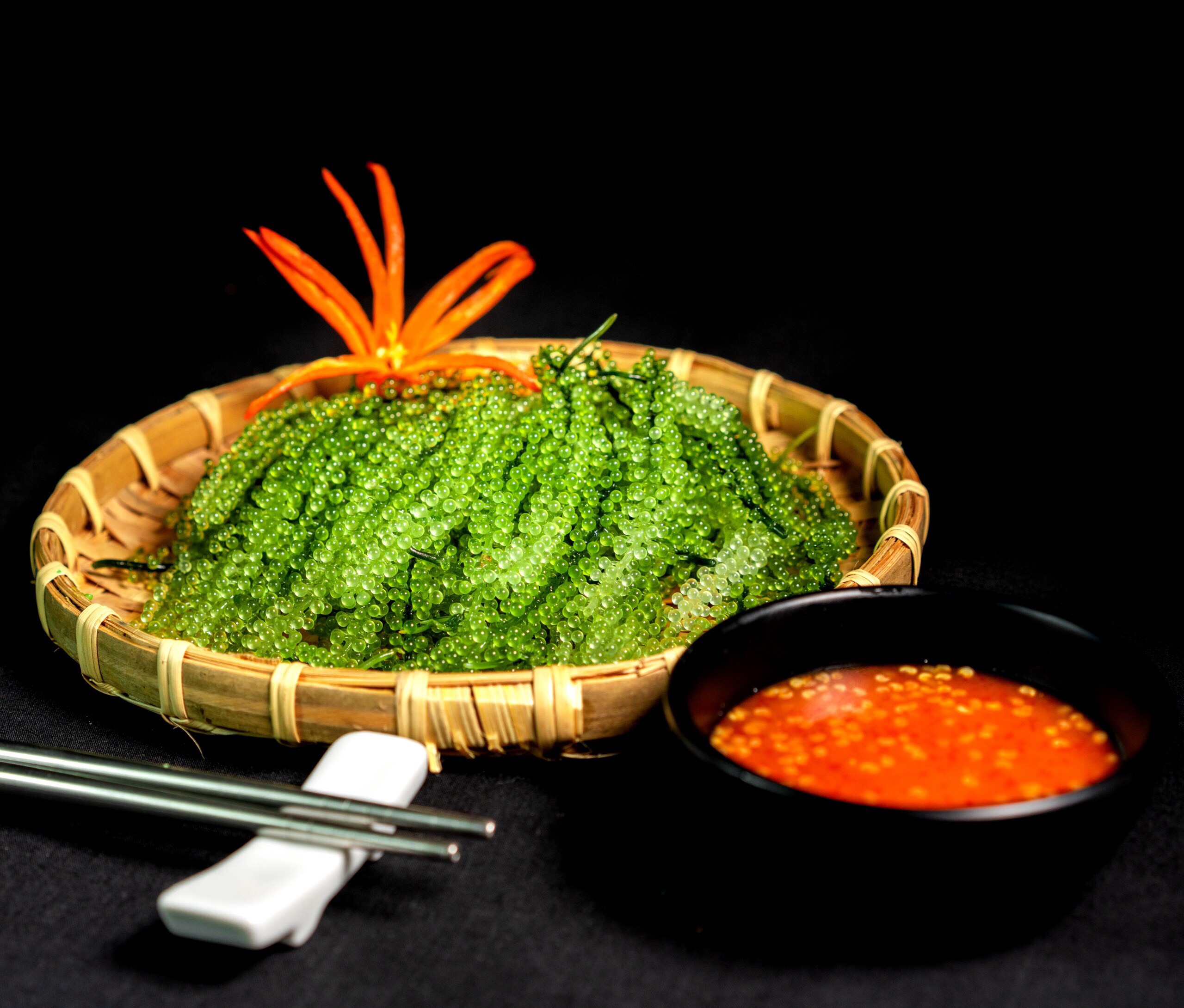 - Bước 3: Dùng ngay trong vòng 20 phút vì rong nho tươi sẽ xẹp lại “Dùng làm món ăn khai vị với các loại nước sốt khác nhau (Sốt mè rang, mù tạt, muối tiêu chanh, tương ớt, tương cà…). Hoặc dùng thay thế rau xanh và hải sản hằng ngày (Ăn với cơm trắng, rau sống, làm salad, sushi, sinh tố…). Hoặc đắp mặt nạ làm đẹp” Lưu Ý: Không chiên, xào, nấu chín hoặc đổ nước sốt trực tiếp vào rong nho tươi vì sẽ làm cho chúng xẹp lại