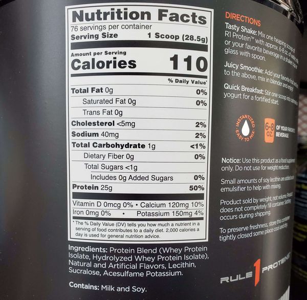 - Rule 1 Whey protein isolate chứa 25 gam mỗi khẩu phần, với 100% whey cô lập , whey thủy phân hiệu quả nhanh, hơn 6 gam BCAAs và hầu như không có gì khác.