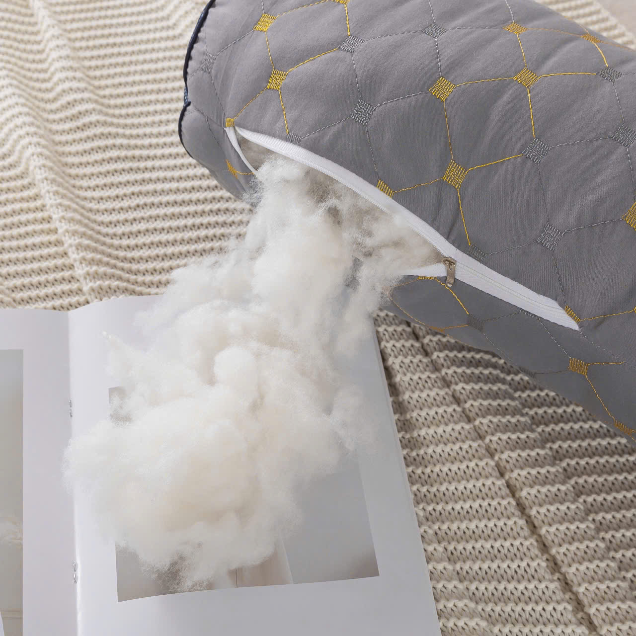 - Vỏ gối vải cotton 100% được đệm 1 lớp bông và chần quả trám rất đẹp mắt và êm ái.