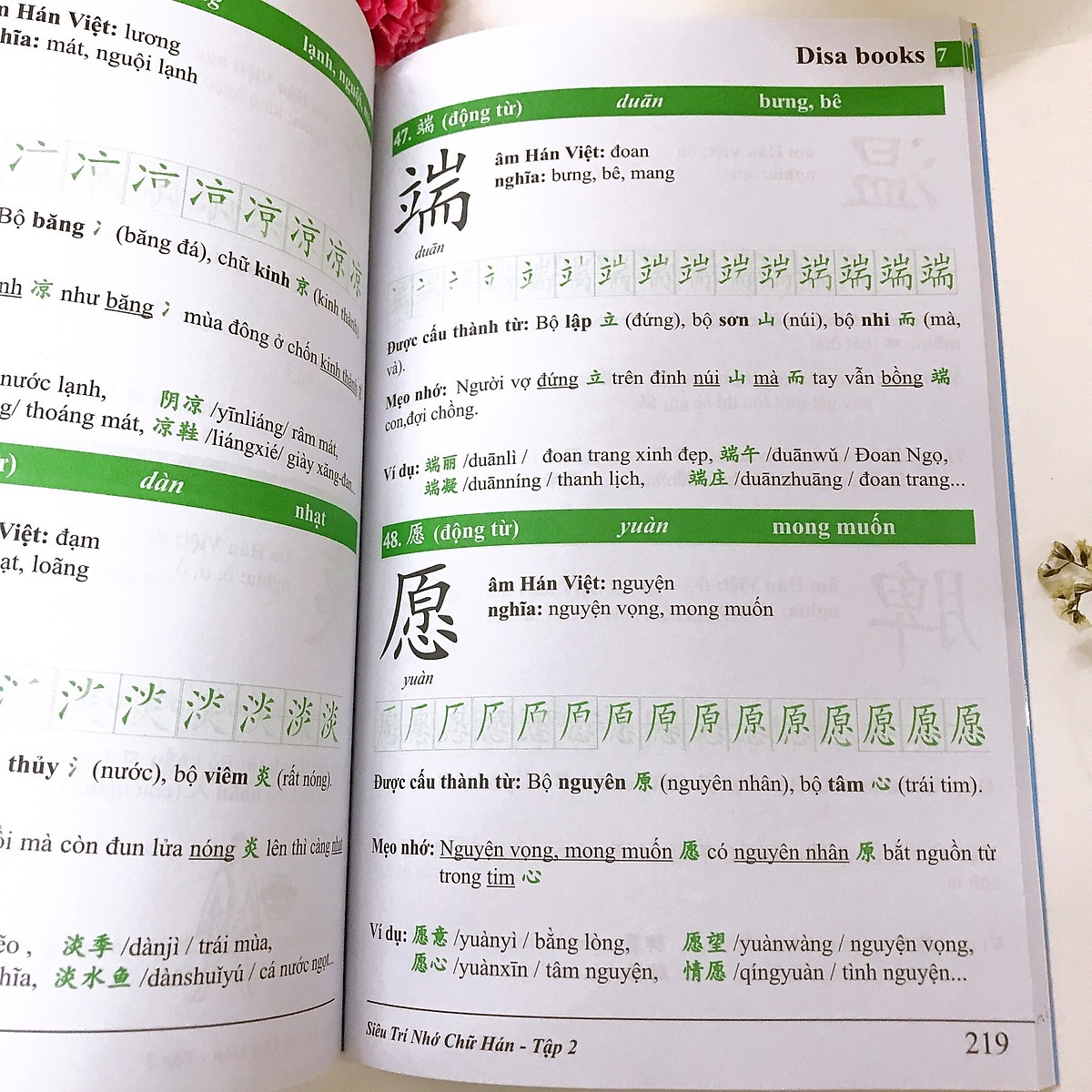 - Siêu trí nhớ chữ Hán tập 01 (In màu, có Audio nghe) Nội dung sách: Giúp bạn dễ dàng nhớ ngay 1000 chữ Hán chỉ sau 2 tháng thông qua mẹo nhớ và hình ảnh dễ hiểu. Tác giả: Diệu Hồ – Phạm Thành Luân Số trang: 250 Năm xuất bản: 2019 Nhà Xuất Bản: Đà Nẵng Cách nhớ chữ Trung Quốc (chữ Hán) a. Nhớ chữ Hán bằng các bộ thủ Bộ thủ chính là cách nhớ chữ Hán hiệu quả nhất, mỗi bộ thủ trong tiếng Hán lại biểu hiện một hiện tượng sự vật riêng. Nhớ được các bộ thủ đó chính là đã nhớ cách viết tiếng Trung như thế nào. Và việc còn lại chính là ghép các bộ thủ đó với nhau để tạo nên được một chữ hoàn chỉnh. vd: chữ 安 Ở trên là bộ 宀 miên => mái nhà mái che, Ở dưới là bộ女 nữ => nữ giới, con gái, đàn bà. Người phụ nữ ở dưới trong nhà thì rất “an” toàn. Ví dụ: 安全 (Ānquán) – An Toàn. Mẹo nhỏ cho những người mới học viết tiếng Trung có thể nhớ đó là dùng các mảnh giấy nhớ, ghi lại những bộ thủ hay những từ mới bằng việc tập viết tiếng Trung. Để những mảnh giấy nhớ đó ở những nơi dễ thấy. Việc nhìn liên tục đó sẽ giúp bạn vừa có thể nhớ chữ vừa có thể nhớ từ. b. Cách nhớ chữ Hán qua thơ Các từ chữ Hán được học bằng cách gieo vần nhịp để người học nhớ chữ Hán dễ hơn như: “Chim chích mà đậu cành tre Thập trên tứ dưới nhất đè chữ tâm” (Chữ Đức) Hay: “Tai nghe miệng nói đít làm vua”. (Chữ Thánh) Nhớ chữ Hán bằng cách vẽ lại những từ đấy. Nhớ các nét, mô phỏng lại và vẽ, đây là một trong những cách rất tốt để nhớ chữ Hán Chữ Hán có hai cách viết là giản thể và phồn thể. Đa phần các giáo trình tiếng Trung đều là chữ giản thể do đó rất nhiều trường hợp đã gặp lúng túng khi tiếp xúc với chữ phồn thể. Nếu để ý thì cách chữ phồn thể có cách viết chỉ khác chữ giản thể một chút. Trong quá trình học, đừng ngần ngại mà nhờ giáo viên chỉ hướng dẫn cách viết chữ phồn thể (viết tiếng trung) nếu công việc của bạn phải tiếp xúc với kiểu chữ này.