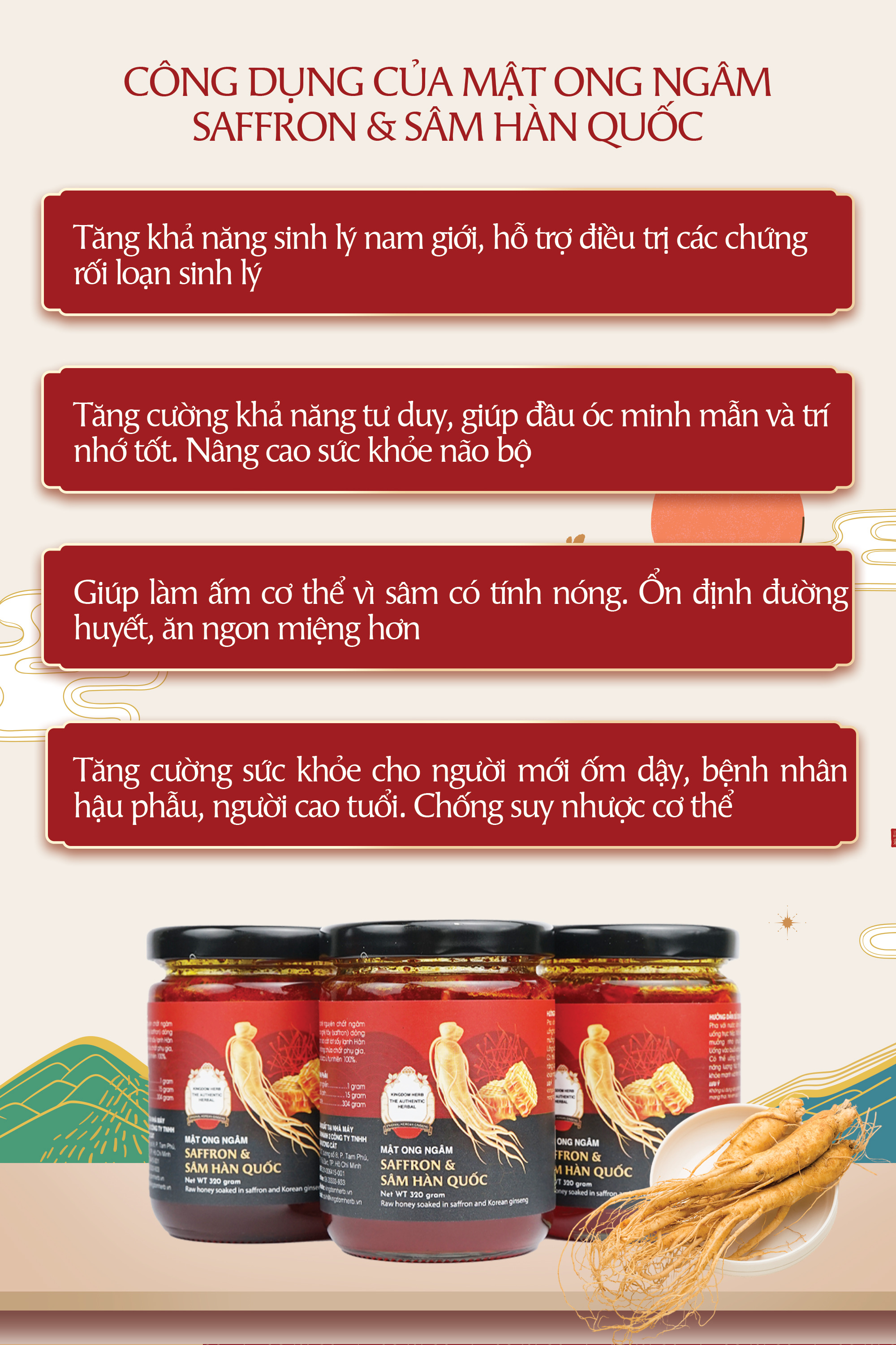 - Thành phần: sâm Hàn Quốc cắt lát sấy lạnh, saffron nhụy hoa nghệ tây super negin Organic và mật ong hoa cà phê nguyên chất 100%